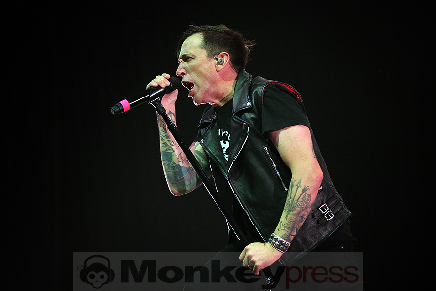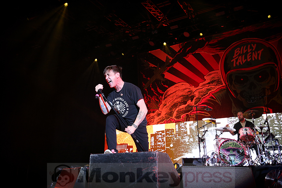 Das Publikum war angemessen „warmgesoult“ worden und die augenzwinkernde Frage von Frank Turner, ob wir einer kanadischen Band eine Chance geben würden, die zum ersten Mal in Deutschland sei, musste man natürlich nicht ernsthaft beantworten. Wurde schon bei Act 2 des Abends ordentlich gemosht und gehüpft, so sollte sich dieser Wahnsinn jetzt noch einmal gehörig steigern! In ihrer Attitüde (ja, sie wissen im Gegensatz zu Arschlöchern sogar, was ‚Attitüde‘ heißt) bewegen sich Billy Talent noch immer recht punkig, denn sie stürmten direkt auf die Bühne, ohne sich groß mit Intros oder dergleichen aufzuhalten. Schnörkellos lassen sie lieber ihre Musik für sich sprechen, genauer gesagt starteten sie gleich mit einem Hit des Erfolgsalbums Billy Talent II, den sogar ich mitsingen konnte: Devil in a midnight mass. Fronter Ben Kowalewicz trug in Düsseldorf stilecht ein Shirt der Stadtgrößen Die Toten Hosen. In seiner ersten Ansage erinnerte der Sänger daran, dass man „150 years ago“ hier in dieser Halle eine Live-DVD und -CD aufgenommen hatte, die den Namen 666 (Live) trug. Auch Devil in a midnight mass und der Folgesong This Suffering wurden auf der entsprechenden CD verewigt und so schloss sich hier, 15 Jahre später, gewissermaßen ein Kreis. „We are so fucking happy to be back here!“ bekannte Kowalewicz. Nach Perfect World gab der Sänger noch einmal das Credo aus, das hier besonders wichtig wurde, da praktisch durchgehend über die nahezu ganze Breite der Halle gemosht wurde: We don’t hurt each other. If somebody needs help we’ll help them!“. Ein Moment der Ernsthaftigkeit in all dem Ungestüm, der nicht nur ein Lippenbekenntnis war, als die Zuhörer dieser Bedingung lautstark zustimmten. Es herrschte eben doch keine Anarchie, sondern es gab Regeln und diese wurden konsequent befolgt. Ich selbst schirmte im Höllenpit zwei winzige Mädchen vor dem Mahlstrom ab und bekam aus kürzester Distanz mit, wie Gefallenen unverzüglich mit vielen Händen aufgeholfen wurde, und wie der Pit immer kurz stoppte, wenn es zu solchen Szenen kam. Das gibt einem die Sicherheit, bei aller rohen Lebensfreude doch auf der halbwegs sicheren Seite zu sein. Solche Ansagen sollten Metalbands auch machen, finde ich!