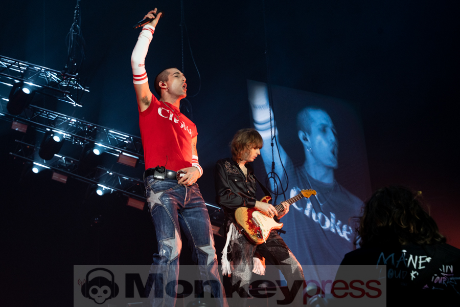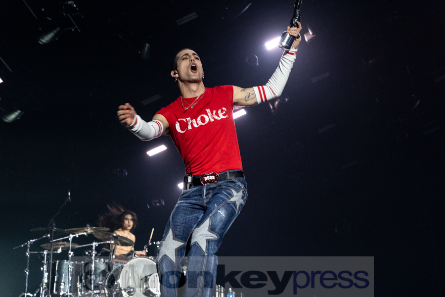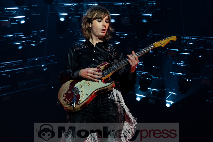 Um 20:10 Uhr fiel dann der Startschuss. Die gigantische Bühne war zunächst von einem roten Tuch umhüllt. Darauf bildeten sich riesengroße Schatten der Musiker, ehe die raue Stimme des Sängers Damiano erklang „Dance, dance, dance, dance, dance until I die!“ Zweifelsohne – die bombastische Party in der Arena war nun eröffnet. Fast den ganzen Song über blieb uns der Blick auf Måneskin verborgen. Umso spektakulärer war die Erlösung, als die Stoffbahnen endlich herabfielen und wir die Band endlich in Augenschein nehmen konnten. Der Name der Tour war bereits Programm, als die Dezibelskala rasant anstieg. Was bekamen wir zu sehen? Modisch sind die vier in der Regel thematisch aufeinander abgestimmt. An diesem Abend waren sie durch Sterne verbunden. Diese befanden sich nicht nur auf den blauen Schlaghosen der Jungs, zwei kleine Sterne zierten auch den Busen von Victoria De Angelis. Dazu trug sie den Hauch eines schwarzen Bodysuits und Overkneestiefel. Schnell zeigte sich, dass die Fans ihre Hausaufgaben gemacht haben, saßen die Lyrics des ersten Titels I Don’t Wanna Sleep des im Januar erschienenen Albums Rush! doch wie eine eins.