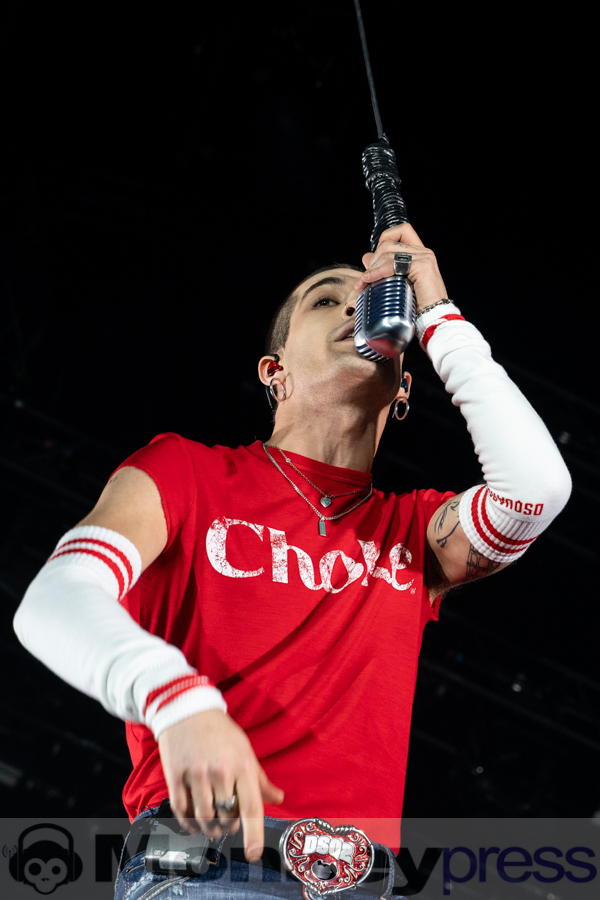 „I need the help of all of you, ‚cause I’m fucking tired.“ Nichts leichter als das. Sofort stimmten alle bei der Nummer Feel mit ein. Der Name war Programm, als sich Damiano erneut bei seinen Fans einfand und er zusammen mit ihnen in die Höhe sprang und er einige seiner Anhänger mit Handschlag begrüßte. Victorias Netzstrumpfhose war mittlerweile ganz schön zerfetzt. Ihr unermüdlicher und vor allem enthemmter Einsatz an ihrem Bass hinterließ allmählich seine Spuren. „I have very sad news. This is the last song – no lie. Since this is a very sad moment, we try to give it some spice and make it more memorable. So, who wants to come on stage?“ Knapp 50 junge Fans stürmten nunmehr die Bühne, und scharrten sich um ihre Heroes: Vorhang auf für die Cool Kids. In der punkig angehauchten Nummer stellten Måneskin direkt klar, dass sie sich in keinerlei Schubladen verfrachten ließen: „We’re not Punk, we’re not Pop, we’re just music freaks.“ Ausgelassen wurde getanzt und das Leben gefeiert, ehe Fans und Band die Bühne verließen.