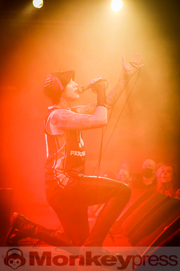 Zeit für den Headliner! Das Intro Warte Warte Noch Ein Weilchen, eine Swingnummer, in der textlich die üblen Taten des Serienkillers Fritz Haarmann aufs Korn genommen werden, läutete das heutige Set von Aesthetic Perfection ein. Daniel Graves schlich sich mit seinem schwarzen Regenhut auf die Bühne. Aufgemalte Sommersprossen verniedlichten sein weiß geschminktes Gesicht. Schlagzeuger Joe Letz platzierte sich im schwarzen Body mit einer blonden Langhaarperücke hinter seinen Drums. Sein Gesicht wurde von einem weißen Tuch verdeckt, das nur seine Augen und Ohren freigab. Dazu zierte ein Aufsatz mit riesigen roten Lippen seine gesamte Mundpartie. Zu seiner Netzstrumpfhose trug er lediglich schwarze Socken, war er es doch gewohnt, sein Instrument ohne Schuhwerk zu verdreschen. Augenweide Constance Antoinette setzte auf einen knappen Bodysuit im Netzlook. Eine weise Wahl – stand ihr doch eine äußerst aktive Performance bevor. Heftig ging es sogleich mit dem Kracher Gods & Gold zur Sache. Constance streckte die Zunge heraus und begann wild zu headbangen. Joe nahm seine Rolle auf der Bühne gekonnt ladylike ein, ließ es sich jedoch nicht nehmen, wild und irre wirkend Vollgas zu geben. Daniel posierte eifrig und reagierte auf den lautstarken Jubelsturm mit entzückten Luftküssen. „Guten Abend Oberhausen! We are Aesthetic Perfection and we are here to party. Do you wanna party with us?“ Der ohrenbetäubende Zuspruch ließ keinerlei Zweifel aufkommen. „Oberhausen, sing with me!“ Gemeinsam hieß es S E X. Grinsend forderte uns Daniel erneut auf  „And just for the mothers“, die Fanschar reagierte mit erhobenen Armen „S E X“. Dazu gesellte sich die pure Eskalation vor und auf der Bühne. Constance zeigte an dem Abend abwechselnd an den Keys und an der E-Gitarre einen hingebungsvollen Körpereinsatz und stand keine Sekunde still. „It’s incredible. We’ve been waiting three long years to make this festival happen. It’s always so wonderful to be here.“ Ein massives Drumgewitter begleitete Rhythm + Control. Joe fasste sich beherzt ans Dekolleté, warf seinen Kopf in den Nacken und entblößte eine Seite seines künstlichen Busens.
