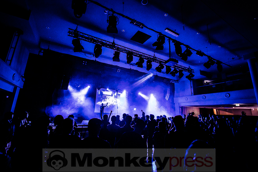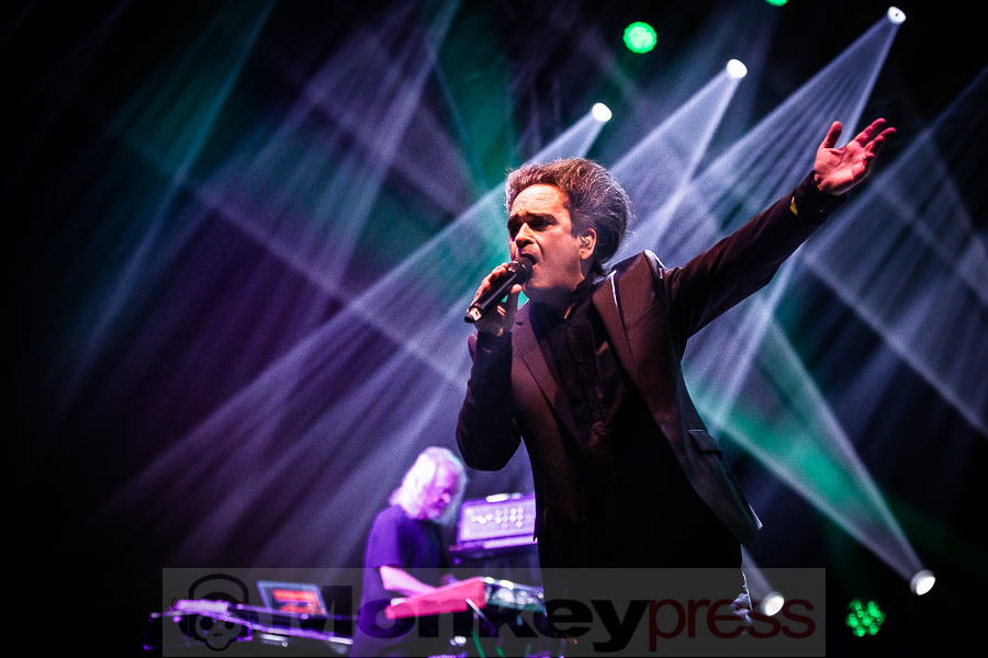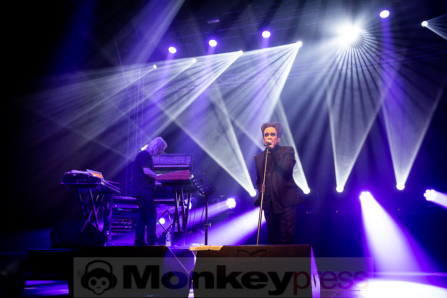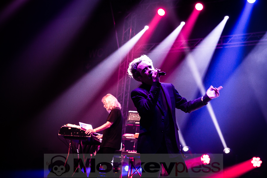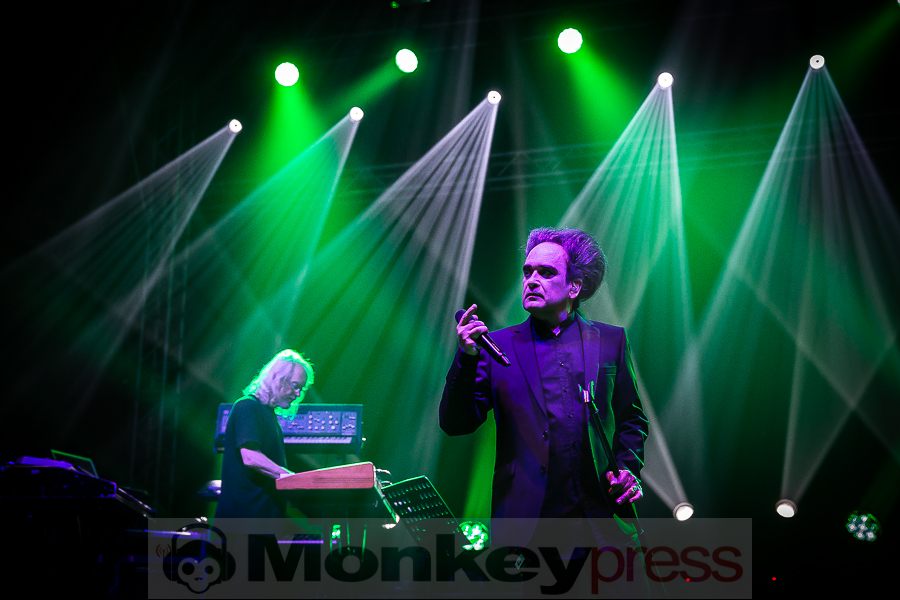 Der Sonntagabend gehörte ganz der melancholischen Musik. Den Anfang machte die Formation Diary of Dreams in der agra-Halle. Es ist schon eine Freude, den Aufstieg von Adrian Hates‘ Truppe mitzuverfolgen. Gerade erst haben sie die erfolgreichste Tour ihrer Bandgeschichte absolviert und größere Hallen denn je gefüllt. Ich selbst konnte das beim Konzert in Wiesbaden bezeugen. Obwohl es sich bei der Musik um recht sperrige, verkopfte Konstrukte mit einer großen Melancholie-Komponente handelt, finden immer mehr Szeneanhänger den Weg in den dunklen Garten des Adrian Hates. Vielleicht ist es auch dem Zeitgeist geschuldet, dass eine Rückbesinnung auf die innere Welt vielen mittlerweile angeraten scheint, schließlich fällt die äußere Welt immer mehr in Trümmer. Diary of Dreams begannen mit dem neuen Song Mein Werk aus Zement und gingen dann gleich in den All-Time-Favourite Epicon über. Neue und alte Songs verschmelzen hier fugenlos, die Handschrift ist immer erkennbar. Der Füllstand der agra war genau richtig: Man konnte sich noch hinreichend bewegen und trotzdem war es angemessen voll. Die erwähnte Hinwendung zum Inneren spiegelt sich auch in den unterschiedlichen Tanzstilen des Publikums wider. Während manche die klassischen, an Industrial angelehnten Bewegungen mit kreisenden Armen vollzogen, gab es andere, die sich vor Schmerzen zu krümmen schienen und wie von Hammerschlägen getroffen, auf und niederzuckten. Ich habe schon oft beschrieben, was diese Band in vielen Menschen auslöst, hier korrodieren und brechen auf ganz außergewöhnliche Art die Schutzwälle, die man um sein Innerstes hochgezogen hat. Nach dem ikonischen Menschfeind, den viele an diesem Abend auch als Shirt auf der Brust trugen und dem ebenfalls neuen Song Viva la Bestia verkündete Hates: „Wir reisen rückwärts“, bevor er den 14 Jahre alten Song King of Nowhere anstimmte. Sogar noch älter, „aber immer noch fruchtig“ wurde der Butterfly Dance angepriesen, der auch tatsächlich noch einmal für einen Bewegungs-Boost bei den vielen Nachtfaltern im Publikum sorgte. Sie taumelten dahin, umtost von den Soundteppichen der Klang-Pheromone, die Hates und Co. von der Bühne verströmten und ließen bedenkenlos ihre Energien heraus, ohne an morgen zu denken. Ein Hit jagte den nächsten und ein Wechselbad der Emotionen nach dem anderen wurde eingelassen, in sich aufgenommen und dann wieder abgestoßen, bis man sich dem Höhepunkt näherte. Auch bei Diary of Dreams kam irgendwann die Frage auf, ob man „den einen Signature-Song“ immer noch spielen sollte. Den man gleichsam totgespielt zu haben glaubte und ohne den gefühlt keine Live-Setlist mehr ausgekommen wäre. Man kann über den inhärenten Zwang dieser Überhöhung trefflich diskutieren und philosophieren. Aber die Band hat einen guten Kompromiss aus dem Hunger der Fans und ihrem eigenen Bedürfnis nach Veränderung gezogen und spielte Traumtänzer in einer alternativen, reduzierten Version, quasi als Semi-Akustik-Fassung. Hates bedankte sich danach für den „wunderschönen, kurzweiligen Abend“. WIR haben zu danken!