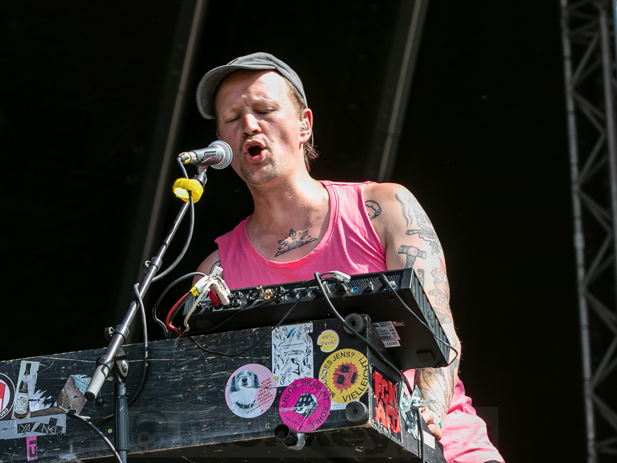 Da ich ja nun zwar alt bin aber mich nicht vor junger Musik verschließe, höre ich auch sehr gerne neuen deutschen Punk. Muss ich hier auch auf Größen wie Turbostaat oder Love A verzichten, treibt es uns nun doch endlich mal zur weit abgelegenen Mountain Stage. Hier sollen Akne Kid Joe spielen. Ich bin vorerst überrascht, da wir tatsächlich die einzigen vor dieser großen Bühne sind. Die Band macht ihren Soundcheck noch selber und wirkt erst noch etwas unbeholfen. Doch gut zehn Minuten später, ich war doch nicht mehr ganz alleine vor der Bühne, hauten Sängerin Sarah und Sänger Matti ihren Punkrock durch die PA und es kam sehr schnell gute Stimmung auf. Im Fahrwasser von Pascow hat die Band ihre ersten Lorbeeren verdient gemacht und auch hier füllt sich der Platz vor der Bühne stetig. Ich könnte mir schon vorstellen, dass Akne Kid Joe, so dilettantisch sie auch klingen, weiter in der Szene entwickeln werden.