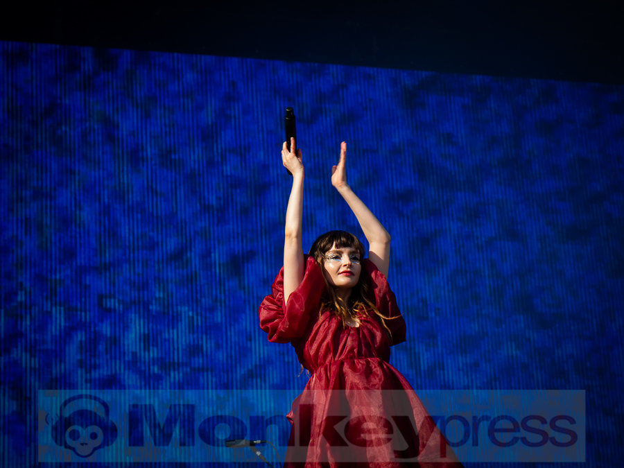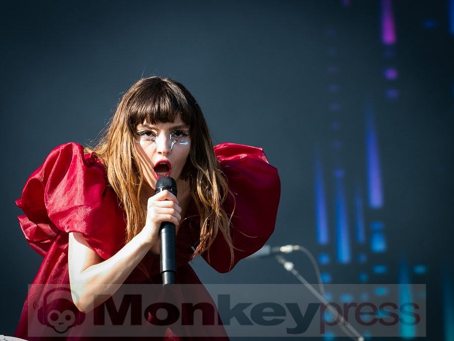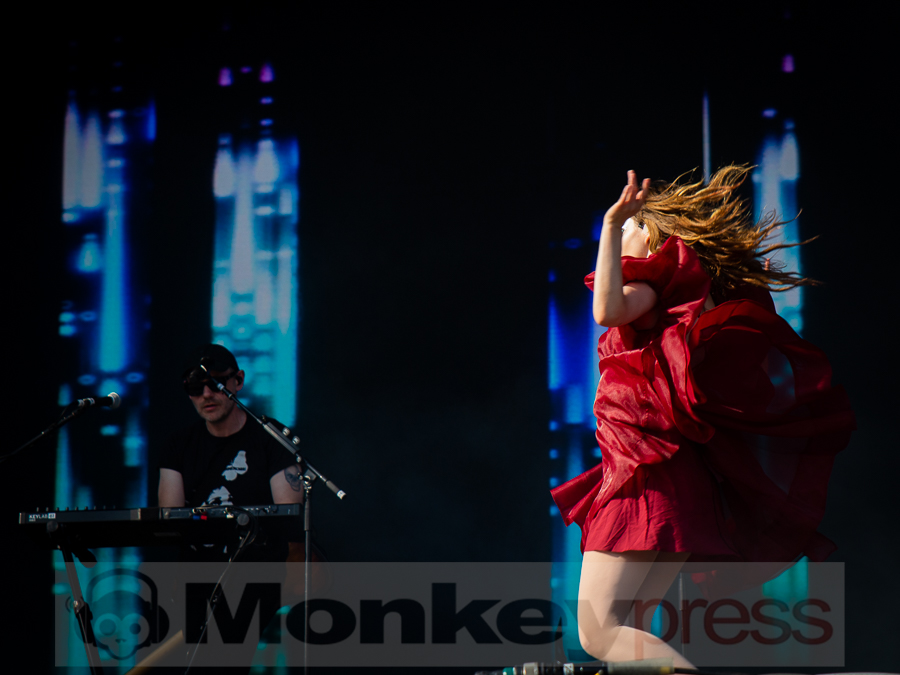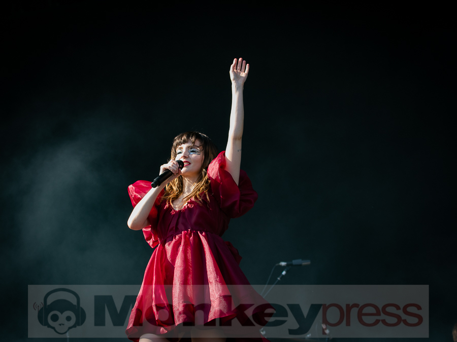 Nach diesem eher enttäuschenden Set trabte ich also wieder los zur River Stage. Hier sollen gleich die Briten von Chvrches auf die Bühne kommen. Habe ich sie jetzt schon zweimal live verpasst, soll ich jetzt in den Genuss eines wirklich tollen Sets kommen. Lauren Mayberry gekleidet wie eine gute Fee wirbelt nicht über die Bühne, sie schwebt. Sie tänzelt wie eine Ballerina und hat dazu auch live eine so schöne Stimme, dass auch ich nicht nur von der immer unangenehmeren Hitze und der drückenden Luft dahinschmelze. Geschätzte 20.000 Kehlen singen und feiern diese Band, die wie ich finde, ihren jetzigen Status mehr als verdient haben. Aber mehr als 60 Minuten gibt man auch Chvrches nicht. Leider oder zum Glück? Dunkle Wolken am Horizont und aufkommender Wind kündigen an, was in wenigen Momenten über das Hurricane Festival hereinbrechen soll.