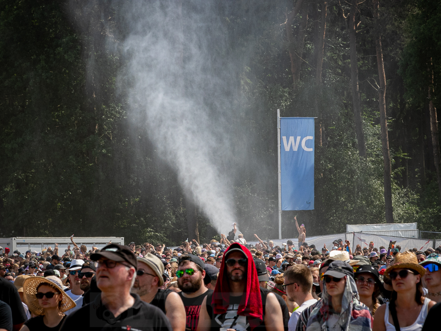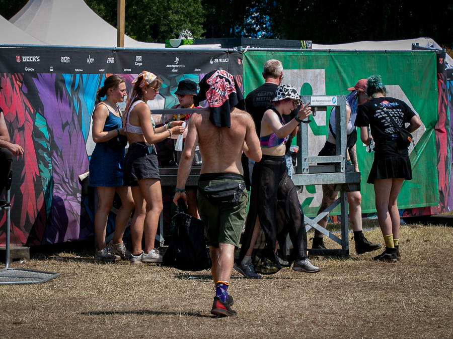 Okay, Tag 2 des Hurricane Festivals. Heute soll es dann doch etwas entspannter werden. Aber der Acker ist am Samstagmittag bereits sehr aufgeheizt und die Luft ist staubig und dreckig. Viele Festivalbesucher haben sich Tücher um Mund und Nase gebunden, um diesem Staub irgendwie zu entkommen. Bereits zu früher Stunde sammeln sich die Besucher an den Getränkeständen und an den kostenlosen Wasserstellen, um Trinkgefäße aufzufüllen oder auch schnell mal den Kopf abzukühlen.