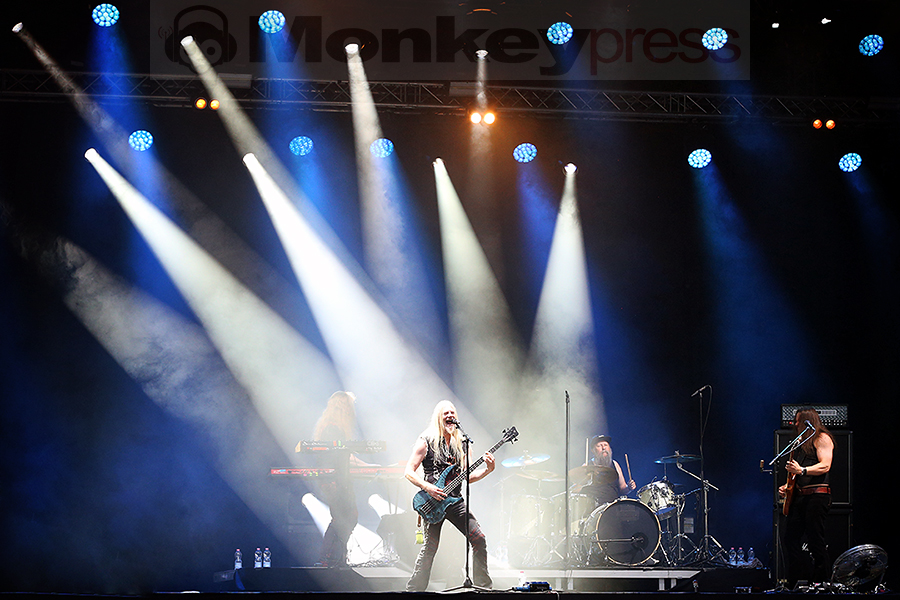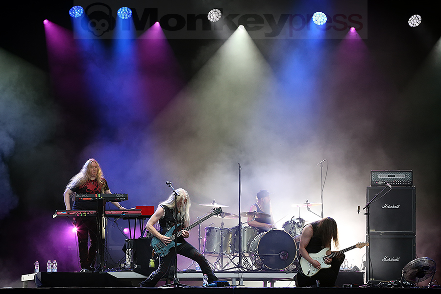 Dass sie als Einheimische die Menge auf Schweizerdeutsch ansprechen konnte, verbesserte den Transfer natürlich, wir Zugereisten mussten etwas rätseln, konnten uns mit den Schweizer KollegInnen aber wenigstens darauf einigen, dass es ein Opener nach unser aller Geschmack war. Illumishade gelang es nicht nur aufgrund der heißen Temperaturen, der Zuhörerschaft einzuheizen. Aktuelle Singles wie Hymn und The Horizon Awaits rundeten das gelungene Set ab. Zwischendurch mischte auch die Natur mit, als ein Weißstorch über die Bühne flog. Ich bin kein guter Augur, aber ich deute diesen Flug als wohlwollende Zustimmung zu mitreißenden Songs wie What have I become. Mirjam am Keyboard mischte auch kräftig mit, nicht nur an den Tasten, sondern auch stimmlich und erweiterte den Sound von Illumishade beim vorletzten Song durch Einsatz eines Theremins. Großartig. Fabienne forderte gegen Ende auch Tribut für die noch wartenden Bands in Form von Applaus und Jubel und wurde selbstverständlich nicht im Stich gelassen.