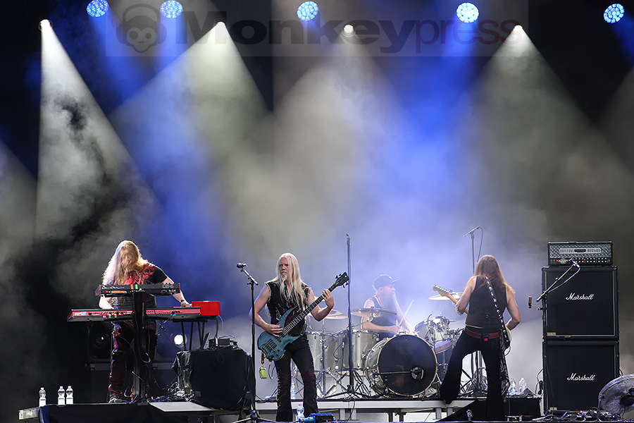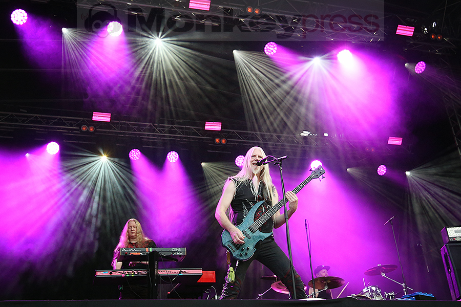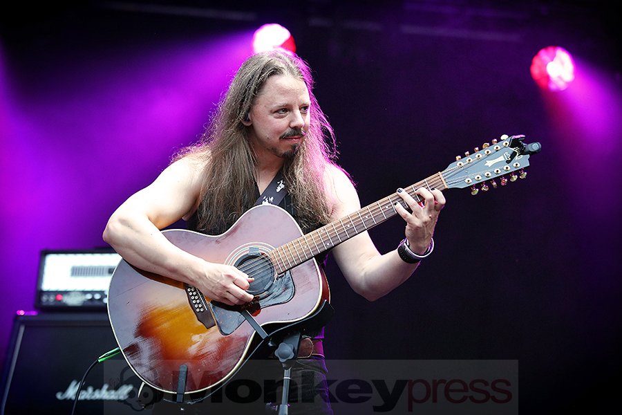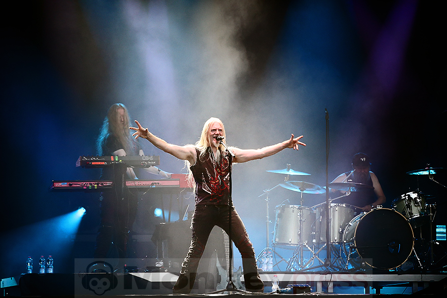 Für all diejenigen Körper, die aufgrund der Verbrennung etwas „crispy“ zurückgekommen waren, wurden auf dem großen Stein kleine Namensplaketten angebracht und das habe ihn zu dem Song inspiriert. Hier bekam man also keineswegs stumpfe Rockmusik zu hören und ich glaube, viele Anwesenden waren sehr positiv überrascht. Man kennt Markos Facetten kaum, sondern lediglich sein Werk mit Nightwish und einige werden sich auch an sein Hardrock-Projekt Tarot erinnern (das Interviews zufolge ggf. vor einer Wiederbelebung steht). Der Fronter erklärte jedenfalls geduldig zu fast jedem Song ein bisschen was. Vor For You erinnerte er uns an die Weiten des Weltalls und dass unsere Galaxie auch nur in ein Großes, Ganzes eingebettet ist und dass unsere Milchstraße im Zentrum ein großes, schwarzes Loch namens Sagittarius A* beherbergt. „If you have kids coming up, give them this name. Sagittarius“, gab es auch noch Rat für werdende Eltern. Nach einem beeindruckenden Solo von Giattrist Tuomas Wäinölä erinnerte Marko uns an ein Phänomen namens Progressive Rock: „Three minutes of verses and chorus and four minutes of solos“, definierte er lachend. „What happens to romances when they get older?“, fragte er das Publikum danach. „Most of us get fed up with the face in front of us. Things can even become… violent. I’m a guy. At this point I want to take off“, leitete er den Song Vapauden kuolinmarssi ein (Death March for Freedom auf dem englischen Album).