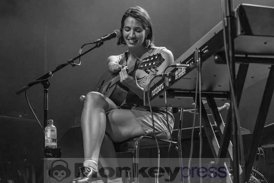 Bevor aber der Hauptact des Abends die Bühne enterte, erwarte uns eine junge Künstlerin, die sich ganz allein zu uns begab. Hierbei handelte es sich um Victoria Canal – eine 24 jährige Singer-Songwriterin, die bereits in vielen Orten dieser Welt gewohnt hat und derzeit in London lebt. In England wurde sie gerade erst bei den Ivor Novello Awards mit dem „Rising Star Award“ ausgezeichnet. Pünktlich um 20:00 Uhr wurde Victoria mit einem warmen Applaus empfangen. Sie nahm mit ihrer Akustikgitarre auf einem Hocker Platz und stellte sich kurz vor. „I’m gonna sing a few songs that I wrote in my bedroom.“ Dann saß sie da – im sommerlichen Look, mit einem Top, einem Rock und pinkfarbenen, großen Ohrringen in Herzform. Mit absolut klarer Stimme und ganz viel Gefühl performte sie Pity Season. „,Shape‘ came out two weeks ago. There’s a little sing along, I’d like to teach you. Is that ok?“ Kaum hatte sie uns den Refrain vermittelt, konnte es auch schon losgehen. Und tatsächlich – die Menge stimmte deutlich hörbar mit ein „Don’t be so pretty in front of me, front of me. Don’t be so pretty, pretty.“ Erst am Ende des zweiten Songs nahm ich wahr, dass Victoria der rechte Unterarm fehlte. Ihr Handicap hielt sie jedoch keineswegs davon ab, perfekt Gitarre zu spielen.