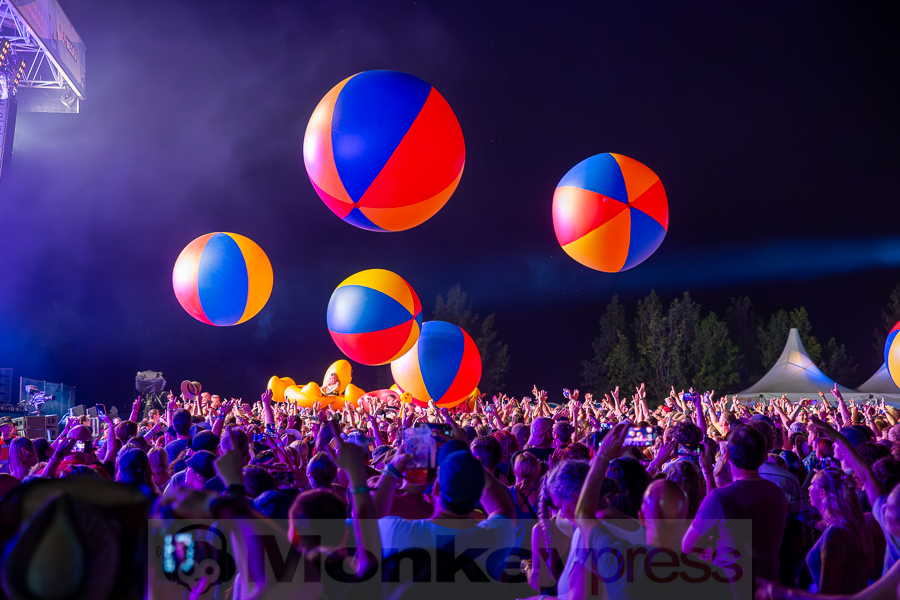 Mit SDP waren wir dann schon beim Headliner des Tages auf der Blue Stage angekommen. Die Bühne war noch mit einem Banner verhüllt, als „Sicherheitshinweise“ aus den Boxen erklangen. Dann fiel das Banner und Du Hast Gehofft erklang. Die Menge klatschte direkt mit und natürlich wurden die Texte mitgegrölt. Pyroeffekte und eine tolle Lichtshow rundeten das Gesamtkonzept ab. Die beiden Rapper Vincent und Dag-Alexis wurden an diesem Abend von einer großen Band begleitet, die gut einheizte. Die Fans waren ebenfalls absolut ausgelassen und warfen Konfetti in die Höhe oder pusteten Seifenblasen in die Menge. Die Party wurde noch wilder, als große Badebälle und aufgeblasene Badeinseln über den Köpfen hin und her gereicht wurden – immer wieder ein witziger Anblick. Bei Wenn Ich Einmal Groß Bin kam Vincent an die erste Reihe heran und sang gemeinsam mit seinen Fans. Und dann gab es einen Überraschungsgast auf der Bühne – Die Ärzte-Drummer Bela B. enterte das Ganze und sang den Refrain mit. Das war echt cool und die Massen jubelten nur so. Weitere Hits waren dann Scheiße Baut Sich Nicht Von Alleine oder Ich Will Nur, Dass Du Weißt. Die Fans waren echt zufrieden und tanzten und sangen, was das Zeug hielt. Gegen Ende des Auftritts schoss auf einmal Feuerwerk hinter der Stage gen Himmel – ein toller Moment und schick anzuschauen!