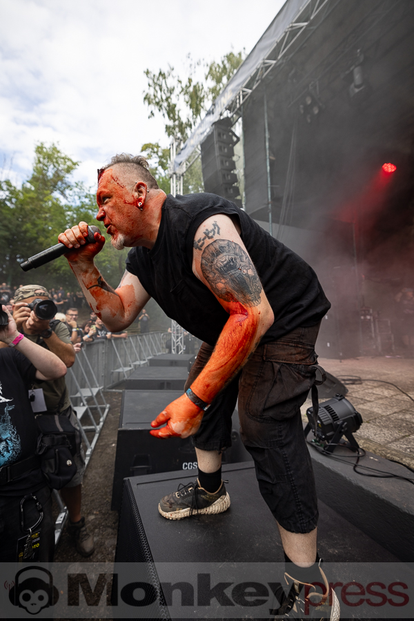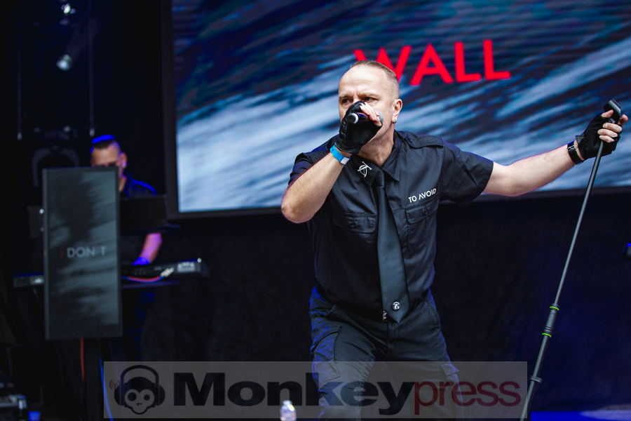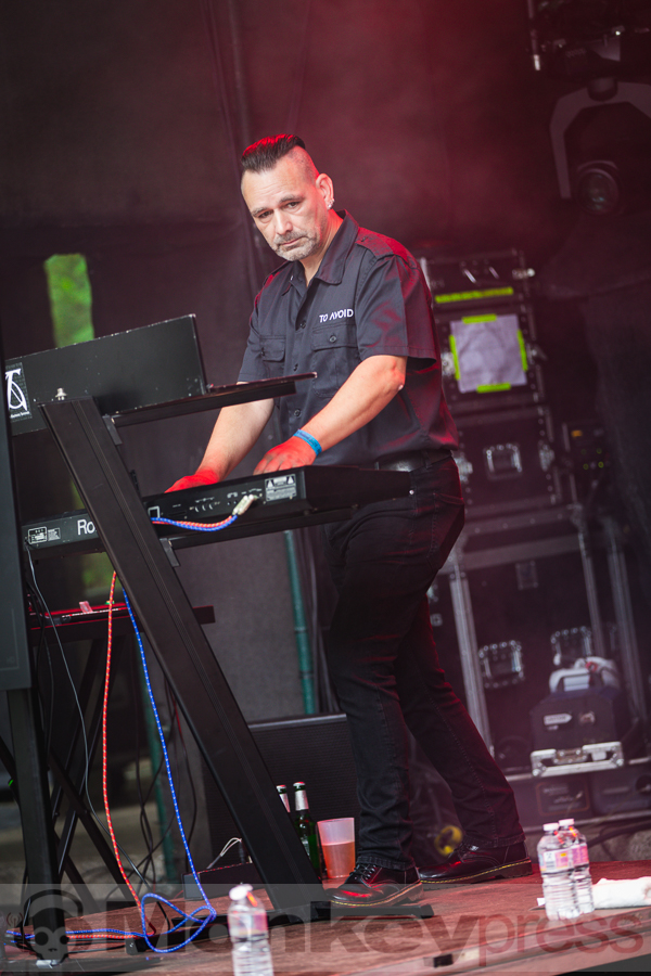 Der Samstag sollte vom Wetter her besser werden, Regen war nicht angesagt. Um 11:00 Uhr begann der Einlass und wie immer kamen die ersten Gäste schon jetzt auf das Gelände, um pünktlich die erste Band anzuschauen. Der Start war diesmal auf der Amphibühne. Die deutsche EBM-Band To Avoid ist bereits seit über 20 Jahren unterwegs. Rhythmische Songs mit verzerrtem Gesang kennzeichnen den Stil der Band und die Musiker legten gleich ordentlich los und brachten die ersten Fans des Tages in Bewegung. Auf der Kulturbühne spielte zur gleichen Zeit Ermes/Harms. Beide Musiker sind bekannt durch die deutsche Dark-Wave-Band Girls Under Glass. Mit diesem Sideproject geht es musikalisch allerdings in eine ganz andere Richtung. Analoge Synthesizer und experimentelle Strukturen kennzeichnen den Stil der Instrumentalstücke. Auch hier fanden sich die ersten Gäste ein und genossen das Klangerlebnis.