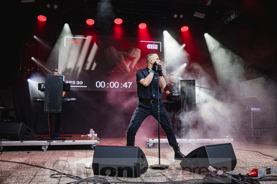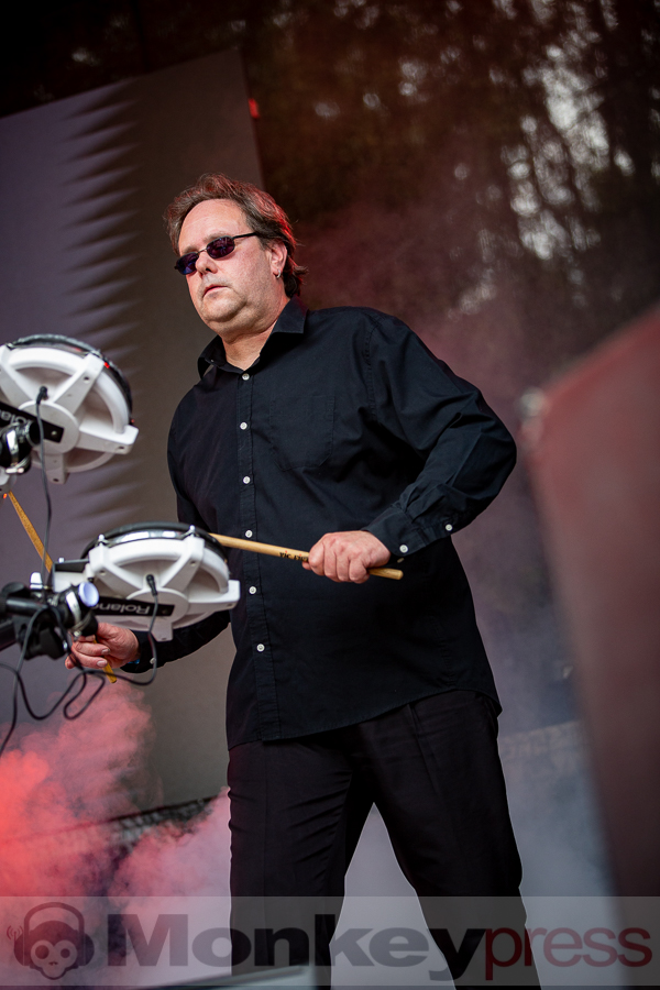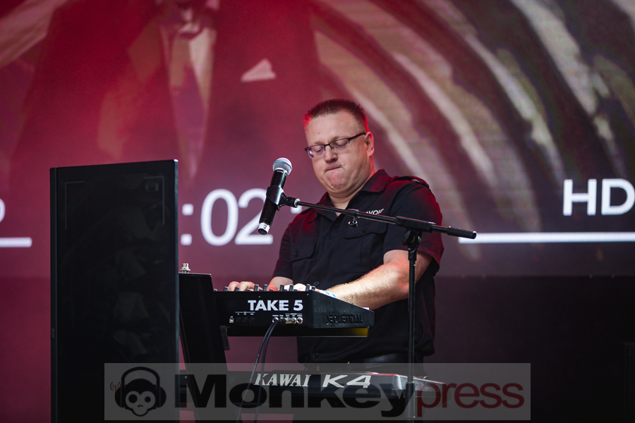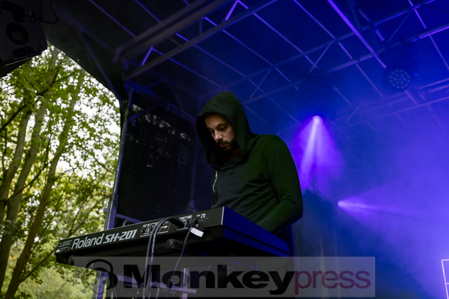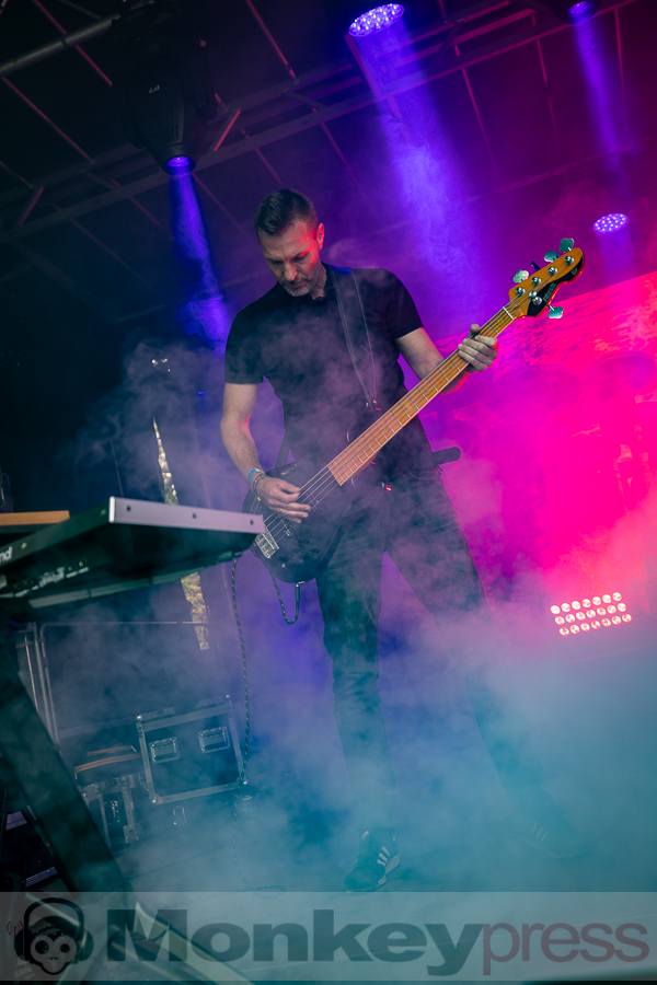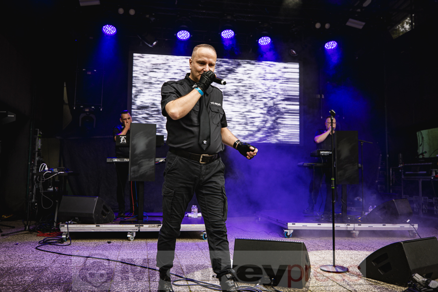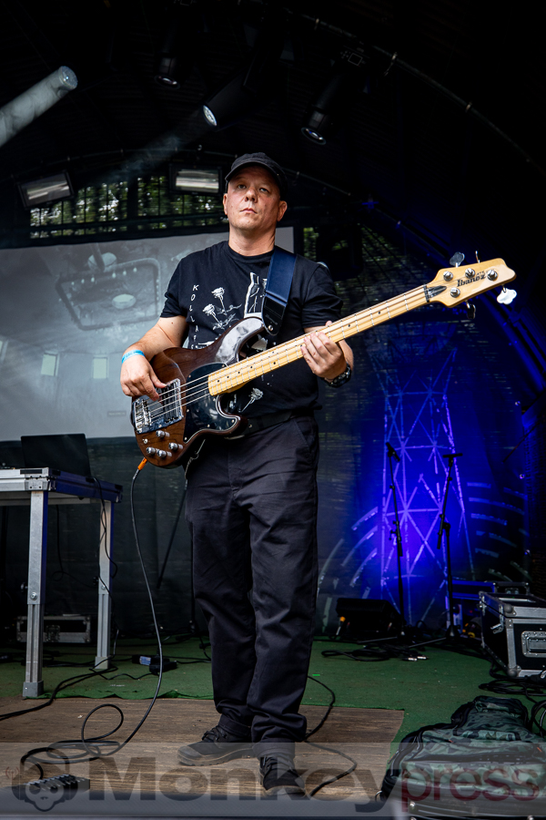 Erstaunlich viele Besucher warteten anschließend an der Parkbühne. Hier begann dann um 13:00 Uhr der Auftritt von End Of Transmission. Die Electro-Wave-Band wurde 2020 gegründet und habe seitdem ein Album veröffentlicht. Der eingängige Gesang und der melodische Sound kamen gut beim Publikum an. Parallel begann auch die erste Show des Tages auf der Waldbühne. Zoodrake wurde 2019 von Hilton Theissen gegründet, der sich schon mit anderen Projekten einen Namen gemacht hat. Hier konnte man nun einerseits Synthie-Pop wahrnehmen, andererseits spielte die Band auch Songs, die mehr in Richtung Alternative Rock gehen. Dieser gelungene Mix lockte auch einige Besucher vor die Bühne.