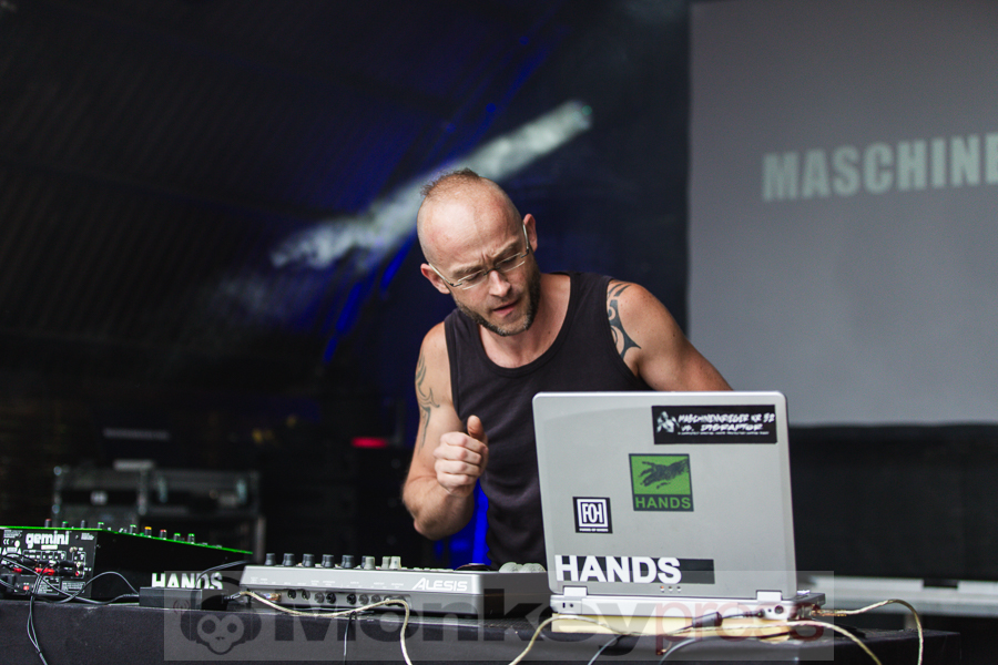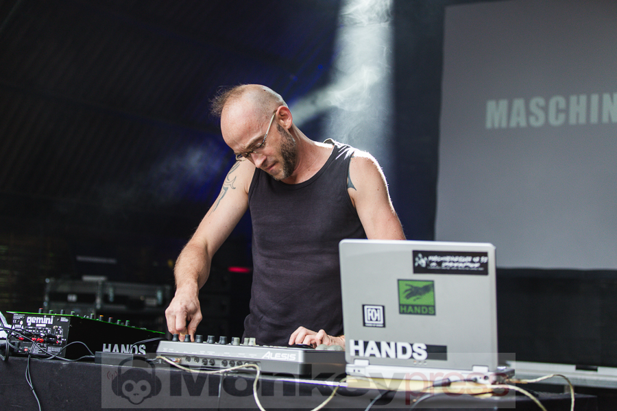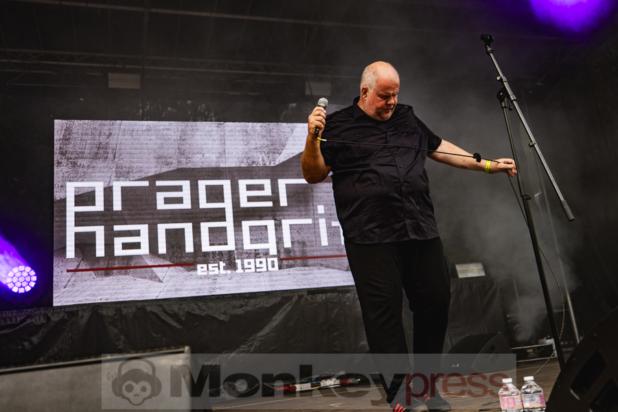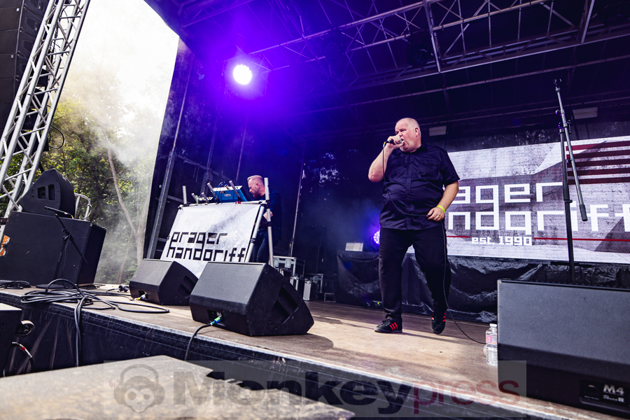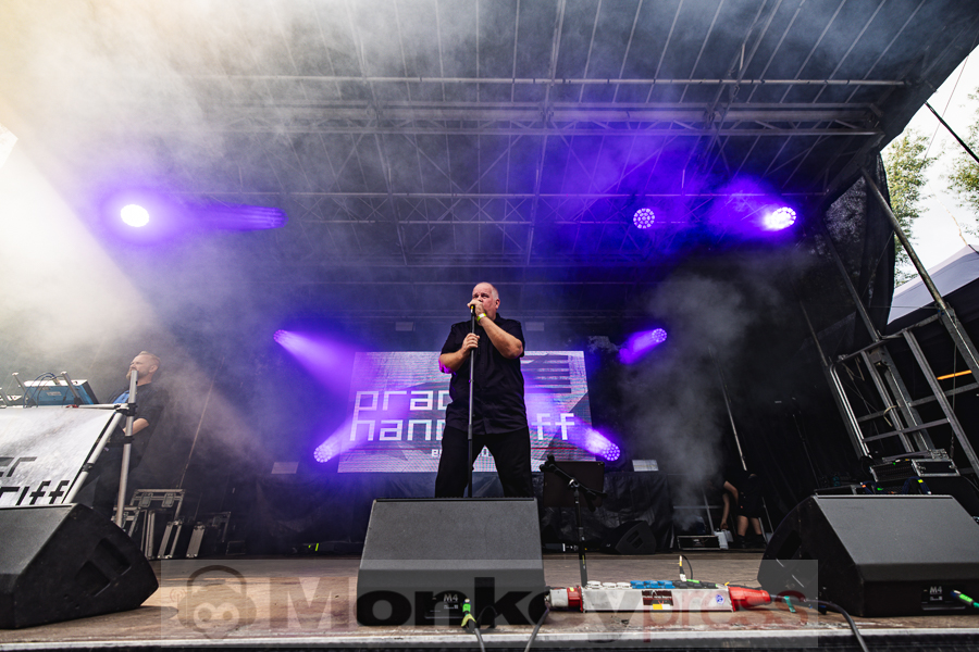 Dicht gedrängt standen nun zahlreiche Besucher vor der Parkbühne. Um 14:20 Uhr wurde es dann Zeit für Parade Ground. Das belgische Duo besteht aus den Brüdern Pierre und Jean-Marc Pauly. Zum ersten Mal sind sie bereits 1981 live aufgetreten. Die Band gilt als eine der ersten Vertreter, die Coldwave und EBM geschickt mischen. Zunächst war die Bühne in Nebel gehüllt. Gleich mit den ersten Songs versuchte Parade Ground mit ihren einprägsamen Melodien das Publikum zu begeistern. Zur gleichen Zeit begann auch die Show der deutschen Elektro-Band Prager Handgriff. Das aus dem Ruhrgebiet stammende Duo macht bereits seit über 30 Jahren Musik. Kennzeichen sind die zum Nachdenken anregenden deutschen Texte und der klassische EBM-Sound. Das Gelände war nun gut gefüllt.