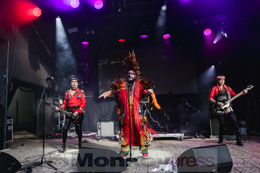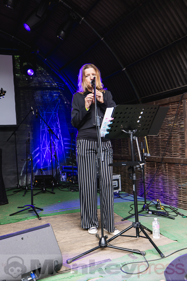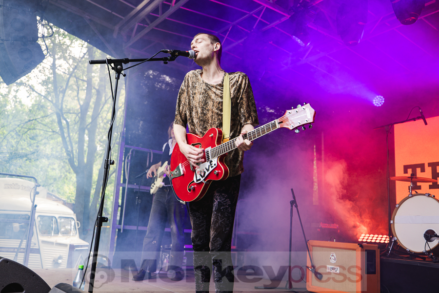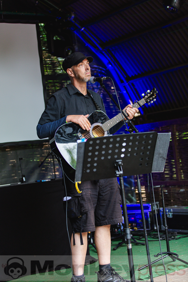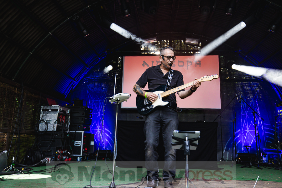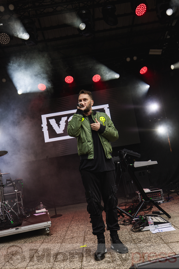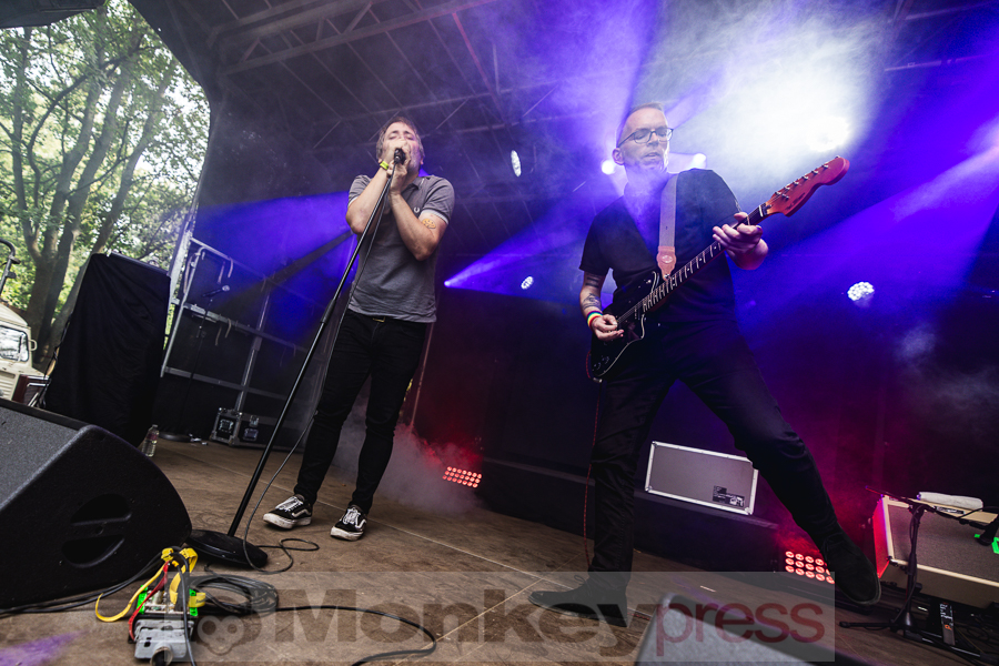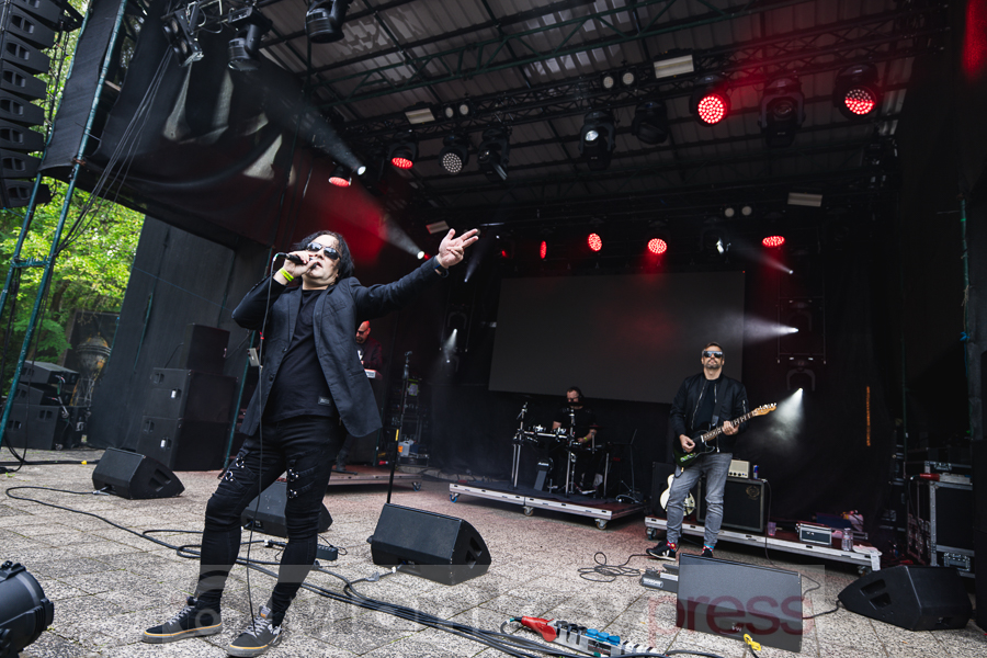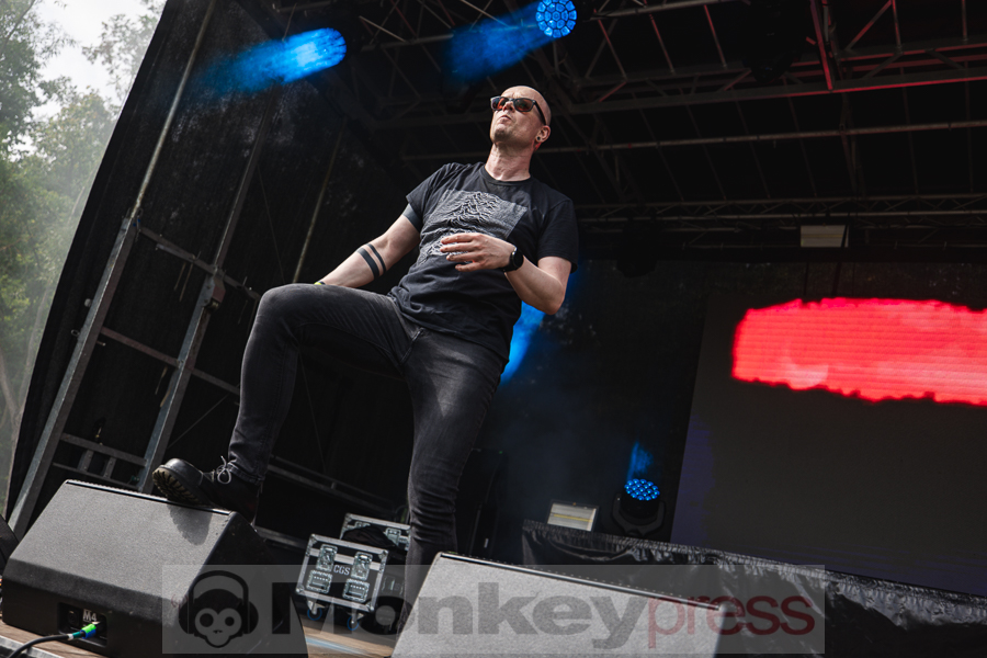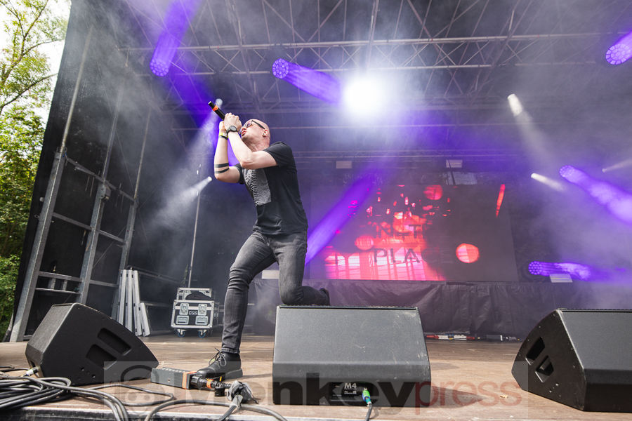 Die erste Band am Sonntag auf der Parkbühne waren Thatcher aus Leipzig. Die Post-Punk-Band macht seit 2020 Musik. Gitarren und Bass dominierten den Sound. Gepaart wird dies mit deutschen Texten und einigen experimentellen Passagen. Einige interessierte Besucher kamen jetzt vor die Bühne. Um 13 Uhr wurde es Zeit für TC 75, dem Soloprojekt von Tino Claus, bekannt durch die Band Amnistia. Der Stil von TC 75 ist ebenfalls im Bereich EBM und Industrial angesiedelt. Hier kann sich Tino Claus frei entfalten. Eine angemessene Fangemeinde stand auch schon vor der Bühne und tanzte zu den harten, aber zum Teil auch melodischen Songs.