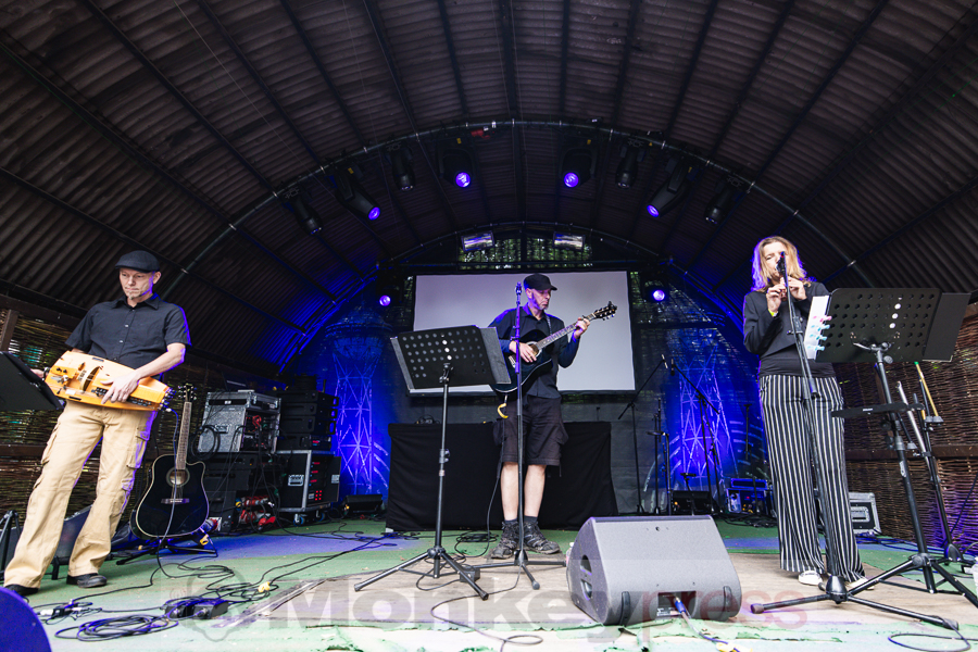 Auf der Kulturbühne wurde es anschließend wieder Zeit für Neofolk. Skadis Odem aus der Nähe von Nürnberg ist ein Projekt von Mika Wilhelmson, dass bereits seit 2000 existiert. Begleitet wurde der Musiker auf der Flöte und der Drehleier. Viele Besucher ließen sich dieses Klangerlebnis nicht entgehen. Kurze Zeit später ging es mit der Münchner Band Versus Goliath auf der Amphibühne weiter. Das 2019 gegründete Trio verbindet in seiner Musik Rock, Metal und Rap. Harter Gitarrensound und Schlagzeug stehen musikalisch im Vordergrund. Die Band legte sich vom ersten Song an richtig ins Zeug und konnte einige Besucher vor die Bühne bringen.