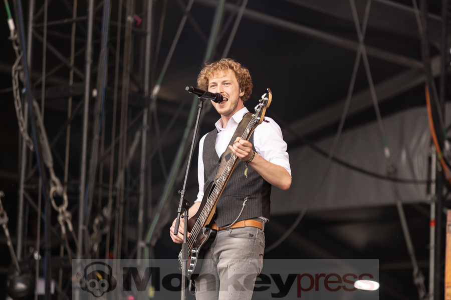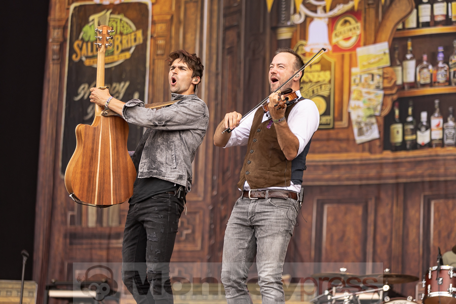 Während Teile der Region bereits in Starkregen und Unwetter versinken bauen sich direkt am Gelände ebenfalls mächtige Gewitterwolken auf, Erinnerungen und Albträume an das letzte Jahr wurden wach und einige Besucher flüchteten bereits Richtung Zeltplatz. Die Botschafter für norddeutsche Beziehungen von Versengold spielten den anfänglichen Regen und das Unwetter mit ihrem Folkrock aber schnell weg. Was kann der Regengott auch gegen den neuen Song Komm Wir Feiern Den Norden oder Kobold Im Kopf entgegensetzen. Zum Ende gehen Malte und Eike noch in das Publikum und spielen von dort Butter Bei Die Fische und Die Letzte Runde. Danach wurde es auf dem Gelände auch merklich norddeutsch frischer für den Rest des Tages und blieb trocken.