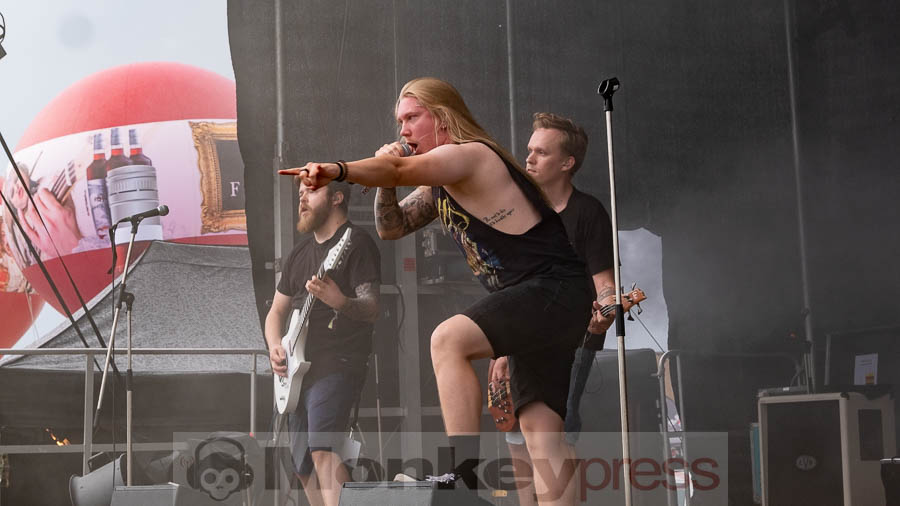 Kurze Exkursion auf die Ficken Stage, wer die jungen Lappen (im Sinne von “Bewohner von Lappland”, genauer aus Rovaniemi) von I Am Your God auf die Party Stage auf dem Campinggelände abgeschoben hat, soll doch bitte einmal rektal gestachelkeult werden. Die Kids um Sänger Julius hauen ihren Mix aus Melodic Death und Power Metal mit Core-Einschlag, der mehr als einmal verdächtig an Children Of Bodom erinnert, trotz relativ geringer Publikumszahl vor der Bühne (die direkt neben dem Ficken-Schnaps-Stand positioniert ist. Hätte man nicht doch J.B.O. oder ähnliche Karnevalskapellen da hinschieben können?) hochmotiviert raus und lassen sich auch vom einsetzenden Regen nicht beirren. Coole Truppe mit bereits 2 Alben unterm Gürtel, die jeder Fan von COB oder auch Trivium einmal abchecken sollte.
