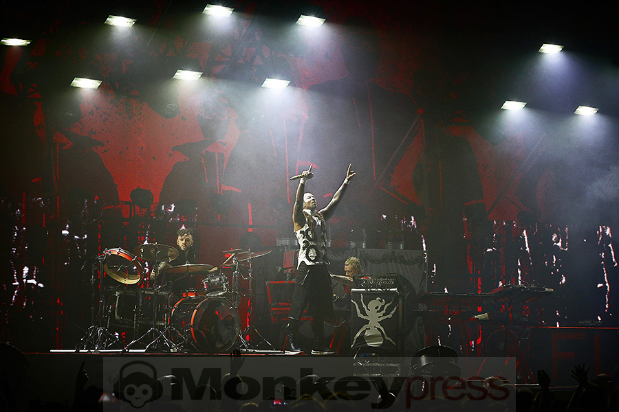 Einige US-Hip-Hop-Klassiker vom Band (Public Enemy, N.W.A. & Co.) in der Umbaupause hielten die Stimmung hoch, bis gegen 21.15 Uhr alles eruptierte. The Prodigy in Person von Liam Howlett, Maxim sowie den Live-Mitgliedern Rob Holliday an der Gitarre und Leo Crabtree am Schlagzeug enterten die Bühne und stiegen wie schon bei der vergangenen Tournee mit einem ihrer größten Hits ein. Gute Wahl. Denn wenn die ersten Töne von Breathe erklingen, gibt es im Publikum kein Halten mehr. „Come and play my game“ – der Aufforderung kamen insbesondere die vorderen Reihen sehr gerne nach, stellenweise war es in Grabennähe etwas schwer, sich kontrolliert auf zwei Beinen zu halten.