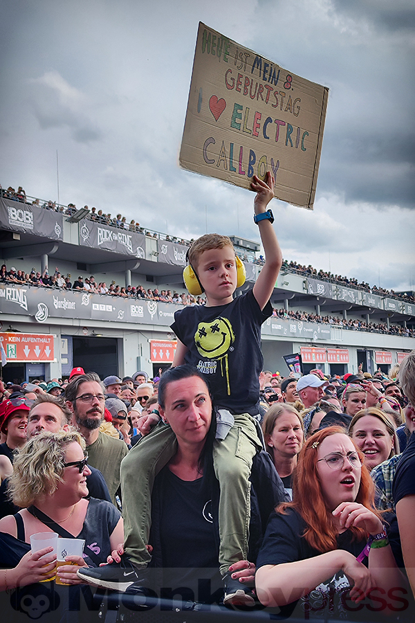 Döp Döp Döp. Das alles ist natürlich nur ein mikroskopisch kleiner Teil von jenem Wahnsinn, der jetzt der Utopia Stage bevorsteht. Döp Döp Döp. Die derzeit international gefragten Kulturbotschafter der deutschen Musikindustrie sind gekommen und haben massig Bock, die Utopia Stage zu elektrifizieren. Japp, es geht um Electric Callboy. Seit sich die Combo endgültig dem seichten Trancecore gewidment hat – das ist kein Diss – sind sie die Partyband schlechthin und wollen das unter Beweis stellen. Aufrichtig und glaubhaft kommt rüber, dass es Electric Callboy als Ehre empfinden, auf dem Rock am Ring zu spielen (mega sympathisches Interview hier). Die Band hat sich auf diesen Auftritt gefreut. Genau wie die Fans, die mit Neonklamotten und Vokuhila-Perücken gekommen sind. Das Infield ist pickepackevoll. Was folgt ist eine großartig inszenierte Show mit Glitzer und Pyro, ohrenbetäubendem Jubel und unzähligen Moshpits. Auf der Tribüne tanzen derweil Kinder zu den eingängigen Beats. Wer bereits Auftritte von Electric Callboy gesehen hat, könnte trotzdem sagen: Perfekte Show ohne große Überraschungen. Doch auf dem Rock am Ring spielen ja auch Babymetal, die kürzlich RATATATA mit Electric Callboy veröffentlicht haben. Ob Babymetal wohl für ein Duett vorbeischauen? Na klar! Alle rasten aus. Aber der Song klingt schon so ein bisschen nach We Got The Moves, oder?