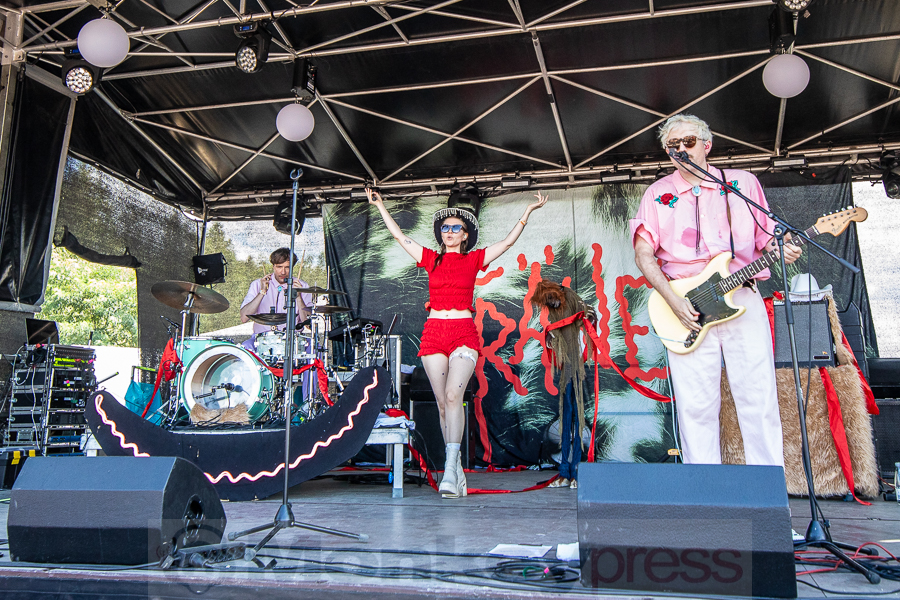 Mit Sand im Schuh warteten wir dann auf eine Band aus Chemnitz. Die Helfer von Tränen umhüllten alles auf der Bühne mit einem roten Schleifenband, dann kamen Gitarrist Steffen und sein Kollege an den Drums in rosa Hemden nach vorn und die Menge jubelte. Sängerin Gwen Dolyn trug einen Cowboyhut, ein Strumpfband und ein sexy rotes Outfit – das sah sehr schick aus. Laut Steffen „rockte“ sie den Look absolut. So legten sie gemeinsam los und die Zuschauer sprangen im Takt auf und ab. „Hallo Leipzig – seid ihr alle gut hydriert?“, so die besorgte Frage der Frontfrau an die Crowd – bei den heißen Temperaturen am See auch absolut berechtigt. Songs wie Schießen lernen, Mitten ins Gesicht oder das Wheatus-Cover Teenage Dirtbag wurden lauthals mitgegrölt und immer waren die Arme oben zum Mitklatschen. Gwen Dolyn hatte sichtlich Spaß und tanzte mit ihren Fans um die Wette – das machte wirklich gute Laune. Sie kündigte zwischendrin an, dass es bald etwas Neues geben wird, was mit viel Beifall begrüßt wurde – was genau, wollte sie aber noch nicht verraten. Auch ein neues Solo-Album von Gwen wurde angekündigt – dieses kann sogar schon vorbestellt werden. Zwischendrin forderte die Band zu einem Flinta-Mosh auf und bat dafür alle intoleranten Männer auf, doch bitte solange abzuhauen. Klar und coole Ansage! Witzig war der Moment, als die Sängerin ein Herz – gebildet aus zwei Sandalen – im Publikum entdeckte – „Wie süß ist das denn?“ Natürlich konnte sich die Band bei all der Party nicht zurückhalten und gab dem Ganzen mit dem Wir sind Helden-Cover Denkmal noch eine kleine politische Note, als sie zum Wählen aufforderten und eine Wall of Love – anstatt Wall of Death – zelebrieren ließ. Und selbstverständlich durfte ihr Hit Stures dummes Herz nicht fehlen. Dieser wurde lautstark mitgebrüllt, was Gwen und ihre Jungs absolut abfeierten. So hatten alle gemeinsam mächtig viel Spaß und für uns war es ein gelungener Start ins Wochenende. Cool gemacht – Danke und gern wieder!