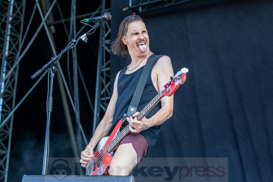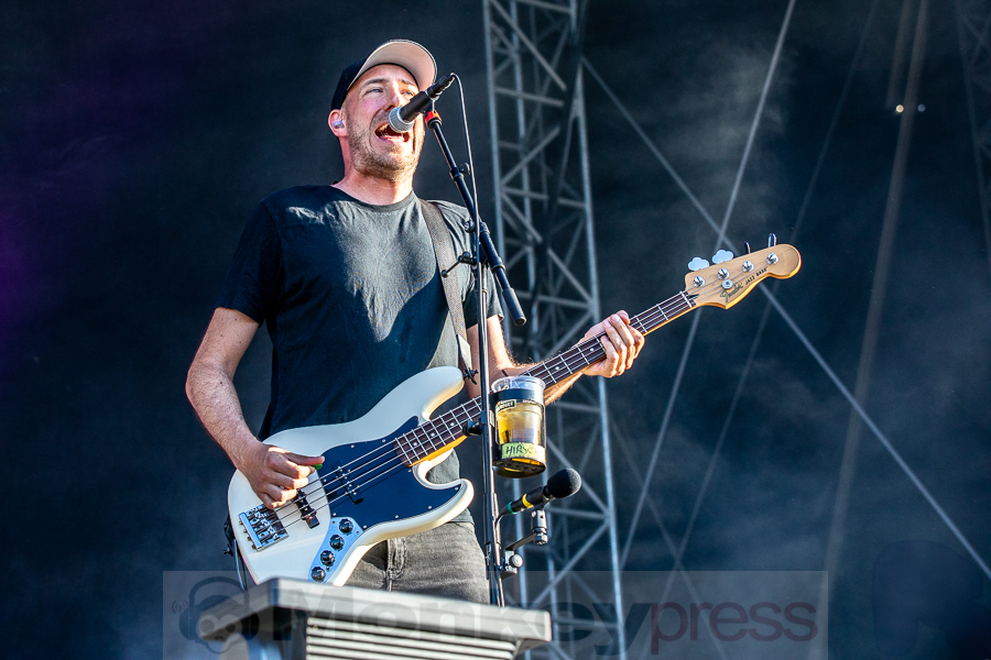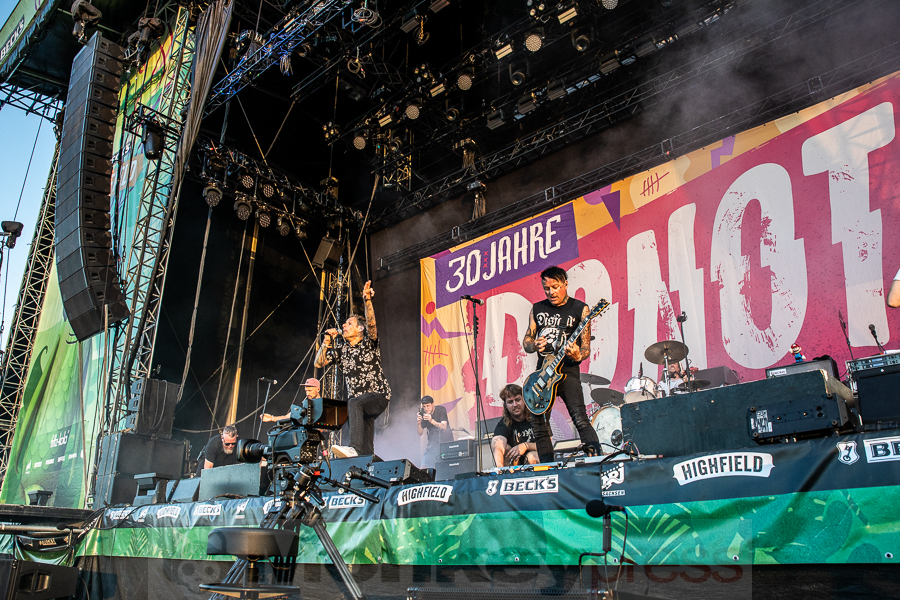 Weil es so heiß war und wir dann Hunger hatten, machten wir ein kleines Päuschen, damit wir für das nächste Highlight des Tages genug Kraft hatten. Die Donots feiern in diesem Jahr ihren 30. Geburtstag und das musste auch hier zelebriert werden. Ein großes Banner verhüllte die Green Stage, was dann aber mit einem lauten Knall fiel und die Band mit einem lautstarken Jubelsturm begrüßt wurde. „Lasst uns durchdrehen“, so die Aufforderung von Frontmann Ingo und das ließen sich die Zuschauer nicht zweimal sagen. Hier war mächtig gewaltig Party angesagt – um nicht zu sagen ein absoluter Abriss! Da bedurfte es eigentlich auch nicht der Aufforderung „Ich will den ganzen Platz tanzen sehen.“ Das erledigte das Publikum schon von ganz allein – es gab Moshpits, Circlepits und auch die, die einfach nur ausgelassen tanzten und ihren Spaß hatten. Wir brauchen wohl nicht dazu sagen, dass die Staubwolke über den Menschen hier riesig war und der Staub so Ingos „Zähne knirschen“ ließ. Drummer Eike war in seinem Element und gab den Rhythmus dazu an. Dabei verausgabte er sich sichtlich. Die Gitarristen Alex, Guido und Jan-Dirk standen immer wieder auf kleinen Podesten und waren so auch in den letzten Reihen zu sehen. Hits wie Calling, Whatever happened to the 80s, We’re not gonna take it oder So long waren hier Garant dafür, dass alle laut mitsangen. Zwischendrin brachten Donots-Rufe die Musiker zum Grinsen – „Es ist schön, wieder da zu sein.“ Ingo hatte so gute Laune, dass er die Festivalbesucher erst als „Highfield-Süßmäuse“ und später als „Dreck-Mäuse“ bezeichnete – wegen des ganzen Staubs. „Wie geil seid ihr bitte?“ – Selber! Das „Fleisch-Metronom“ – ein Armemeer – wogte immer wieder hin und her. Spätestens als Ingo sich gemeinsam mit einem Kameramann mitten in einen Circlepit stellte und beide das unverletzt überstanden, war der Höhepunkt der Show erreicht – „Drecksau is coming home.“ Was ein Brüller. Besser geht es echt nicht! Das machen wir auf jeden Fall nochmal.