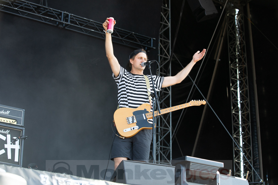 Die Green Stage war an diesem Tag anfangs für den Punk-Teil des Line-Ups zuständig und so kamen nun Montreal aus Hamburg an die Reihe. Sebastian, Yonas und Maximilian hatten richtig Bock und starteten mit Zucker für die Affen voll durch. Die Fans pogten drauf los und das veranlasste die Band dazu, „Ich hab ein gutes Gefühl“ zu äußern. Und sie sollten Recht behalten. Gemeinsam mit dem Publikum feierte das Trio eine wilde Party mit Stücken wie Auf der faulen Haut, Pullover oder dem Steinwolke-Coversong Katherine, Katherine. Der Sound war hier wieder super und vor der Bühne wurde lauthals mitgesungen. Die Stücke wurden nach und nach immer flotter, so dass die Fete echt ausgelassen war. Eines der Lieder wurde vom MDR mitgeschnitten – „Hallo Fernsehen“ – und Konfetti flog zur Feier in der Menge in die Luft. Auch Seifenblasen flogen über die Zuschauer – ein schönes Bild. Uns gefielen die witzigen Texte sehr gut und wir lachten zum Teil sehr ausgelassen darüber. Als Punkband ist es fast unvermeidlich, sich auch mal kurz politisch zu äußern. Das taten die Herren dann mit Idioten der Saison und auch sie forderten alle Anwesenden dazu auf, bei den anstehenden Wahlen ihre Stimme abzugeben – damit die rechten Idioten nicht an die Macht kommen. Mit dem Protestsong gegen Kinos sorgten sie dann aber wieder für grinsende Gesichter und die Pogo-Party konnte weitergehen.