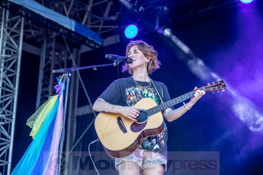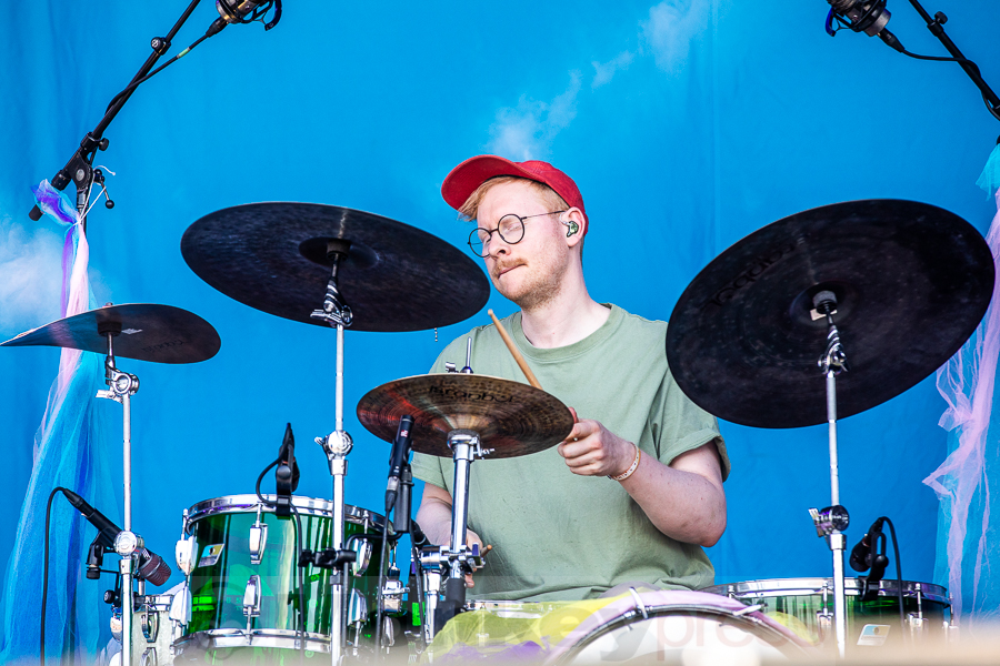Die Blue Stage bot im Anschluss mit Antje Schomaker deutschsprachigen Indie-Pop. Die Sängerin und ihre Mitmusiker hatten all ihre Mikrofonständer mit buntem Tüll geschmückt, was hübsch war. Die Zuschauer kamen aus dem wenigen Schatten vor die Bühne und wurden mit einem knappen „Hallo Highfield“ begrüßt. Sie startete mit dem Titelsong ihres aktuellen Albums Snacks durch und lächelte dabei die ganze Zeit – die Spielfreude war ihr anzusehen und diese gute Laune war ansteckend. Tanzend bewegte sich die Sängerin, in Marvel-Shirt und Spitzenhöschen gekleidet, auf der großen Stage hin und her und nicht wenige Fans taten es ihr gleich – also auch hier wurde ausgelassen getanzt. Bei Lost Indieboy kam Antje an den Bühnenrand und sang dort einzelne Fans in den ersten Reihen an, die dann lauthals mitsangen. Dann griff sie sich eine Gitarre und verriet, dass es für sie eine „große Ehre“ sei, auf diesem Festival auftreten zu dürfen – das wollte sie schon immer mal und nun wurde es endlich Wirklichkeit – „jetzt sind wir ein Teil der coolen Leute“. Mit ihrer beeindruckenden Stimme gab sie Nie nach Paris zum Besten, was mit viel Beifall belohnt wurde. Darüber freute sie sich total und bedankte sich. Im Anschluss hatte sie ein Kinderlied für uns in petto – eines, „wie ich es gern gehabt hätte als Kind“. Mit der absolut wichtigen und großartigen Message – „so wie du bist ist alles richtig“ gab es schließlich Ich bin wichtig auf die Ohren und alle Zuschauer brüllten den Text inbrünstig mit – ein toller und schöner Moment!