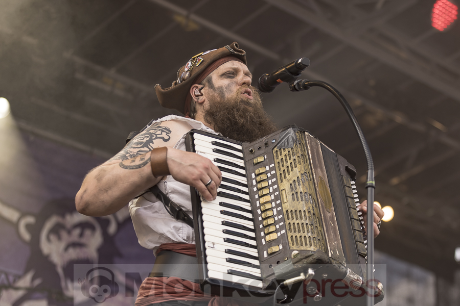 Ohne Kennzeichnung in der Running Order gab es einen kleinen leeren Slot in der Running Order, hier kaperten gegen 14.00 Uhr Mr.Hurley und die Pulveraffen die kleinste Festivalbühne und irgendwie waren hier auch sehr spontan… sehr viele Menschen vor der Bühne. Der Rest ist sicherlich Geschichte, die Band zog gnadenlos ihren Raubzug durch und die Grabenschlampen durften nach dem Metalyoga noch etwas pumpen. Etwas kritisch war hier sicherlich die Kombination Rollstuhlsurfer vs. 1,5m Graben, aber irgendwo muss das Haifischfutter ja herkommen. Das Piratengesindel tickte mal wieder gnadenlos aus, frei nach dem Motto Keine Hose, kein Problem gab es kein Halten bis nach Tortuga.