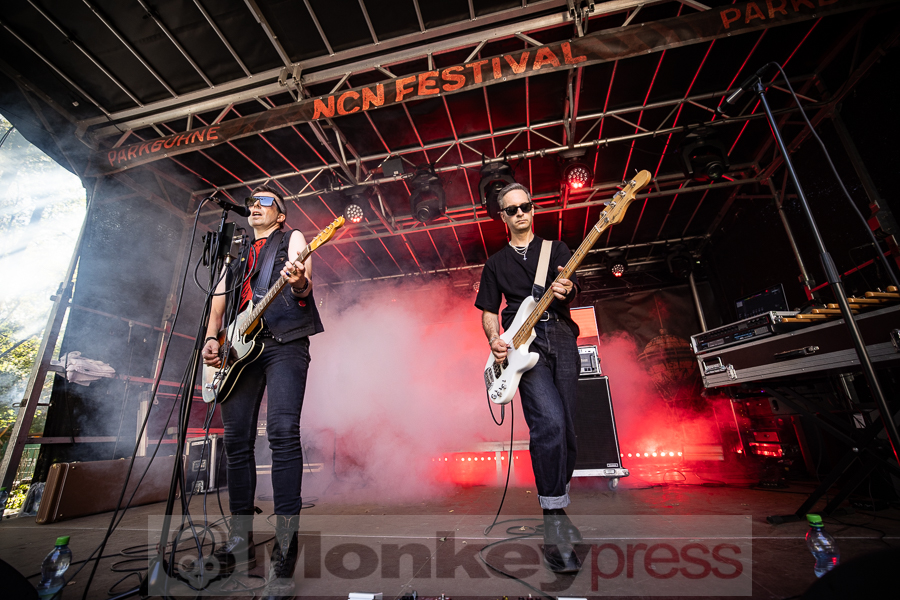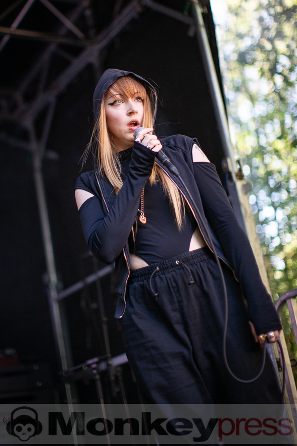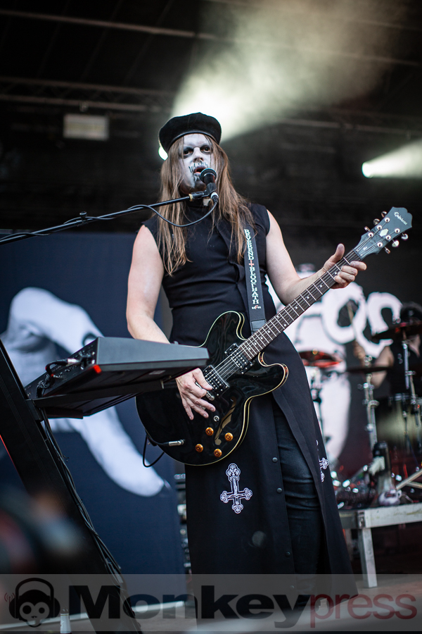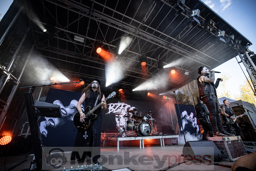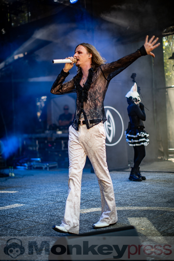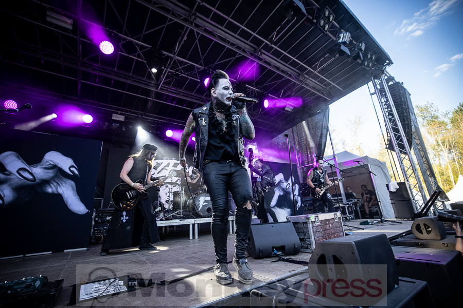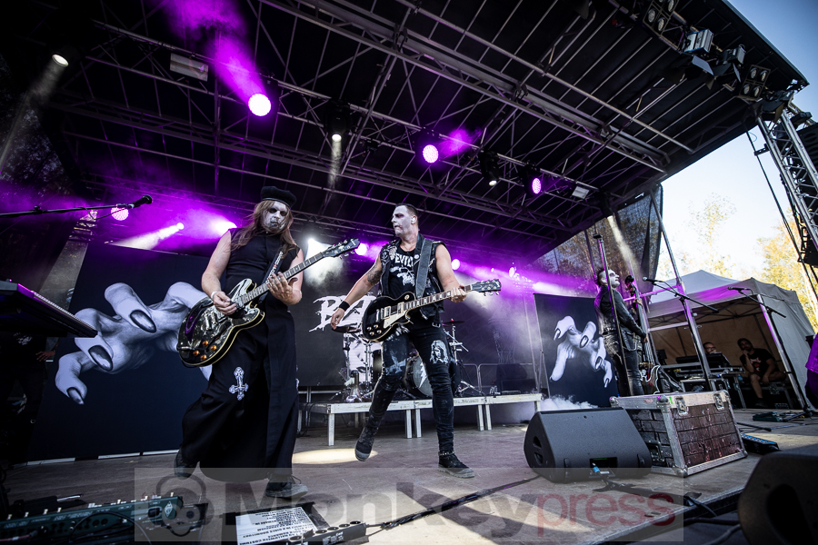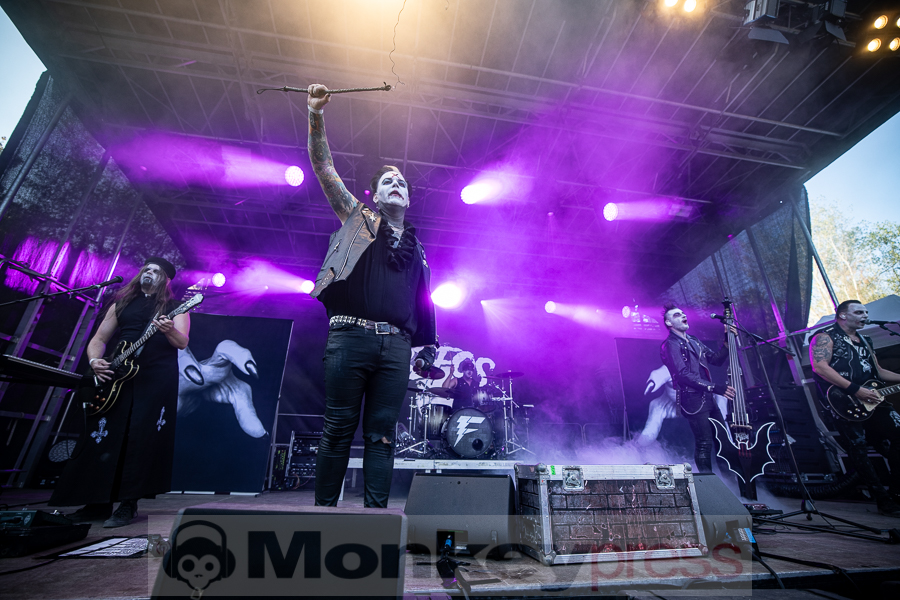 Vor der Parkbühne warteten anschließend bereits viele Zuschauer. Hier begann dann um 16:25 Uhr der Auftritt von End Of Transmission. Die Electro-Wave-Band wurde 2020 gegründet und hat seitdem ein Album veröffentlicht. Der eingängige Gesang und der melodische Sound zogen die Zuhörer sofort in ihren Bann und sorgten für eine mitreißende Atmosphäre. Musikalisch ganz anders ging es zeitgleich auf der Waldbühne weiter. Hier standen nun Bloodsucking Zombies From Outer Space auf dem Programm. Die Horrorpunk-Band stammt aus Österreich und macht schon seit mehr als 20 Jahren Musik. Der Stil reicht von Psychobilly über Horror-Punk bis zu Rockabilly. Sowohl visuell als auch musikalisch konnte die Band überzeugen. Sie lieferten eine spektakuläre Live-Show ab und begeisterten viele Zuschauer.