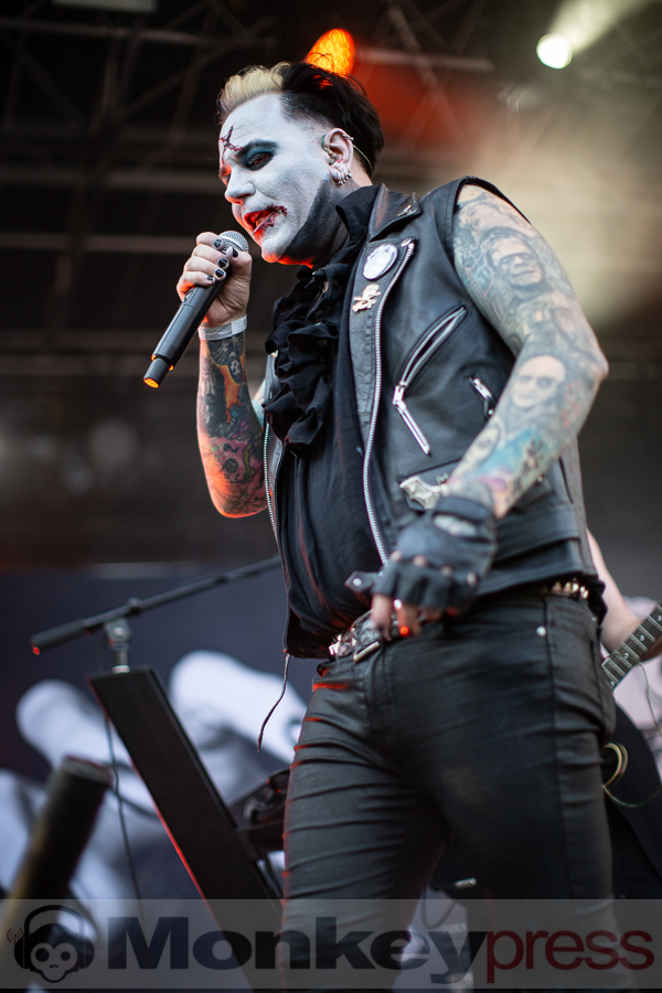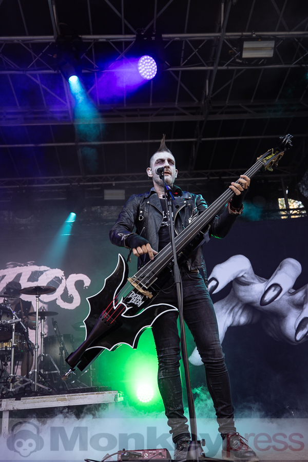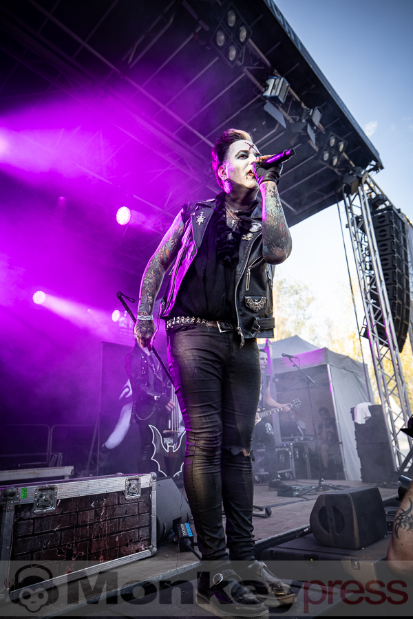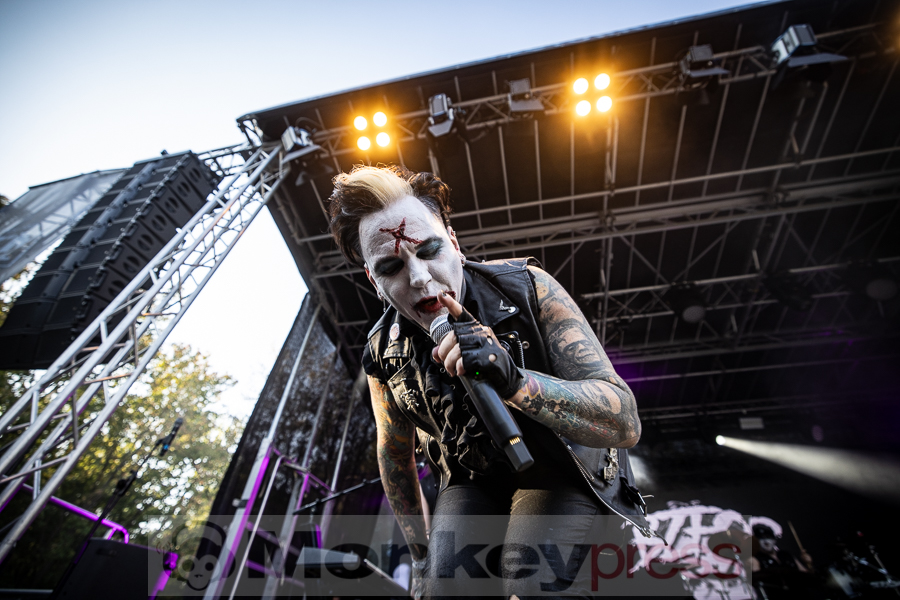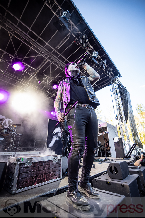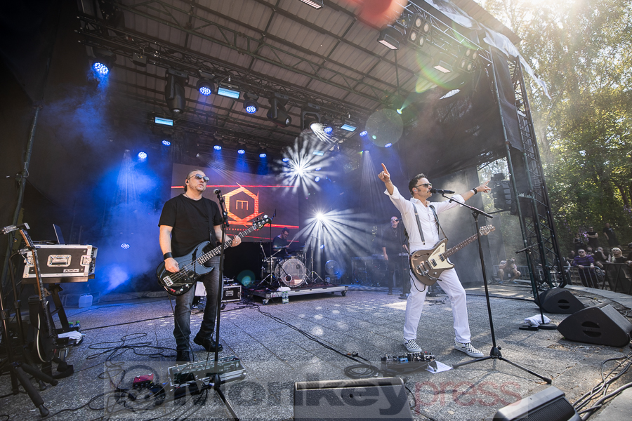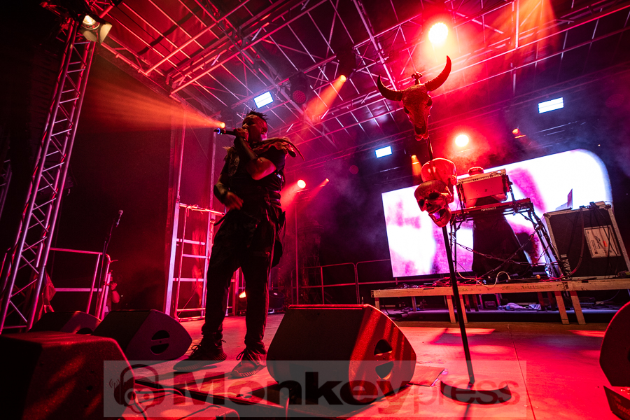 Vor der Parkbühne warteten anschließend bereits viele Zuschauer. Hier begann dann um 16:25 Uhr der Auftritt von End Of Transmission. Die Electro-Wave-Band wurde 2020 gegründet und hat seitdem ein Album veröffentlicht. Der eingängige Gesang und der melodische Sound zogen die Zuhörer sofort in ihren Bann und sorgten für eine mitreißende Atmosphäre. Musikalisch ganz anders ging es zeitgleich auf der Waldbühne weiter. Hier standen nun Bloodsucking Zombies From Outer Space auf dem Programm. Die Horrorpunk-Band stammt aus Österreich und macht schon seit mehr als 20 Jahren Musik. Der Stil reicht von Psychobilly über Horror-Punk bis zu Rockabilly. Sowohl visuell als auch musikalisch konnte die Band überzeugen. Sie lieferten eine spektakuläre Live-Show ab und begeisterten viele Zuschauer.