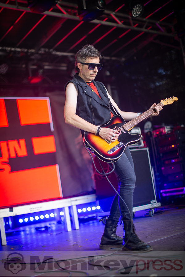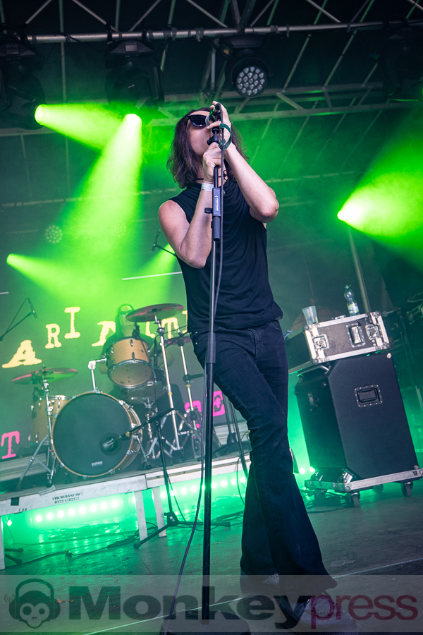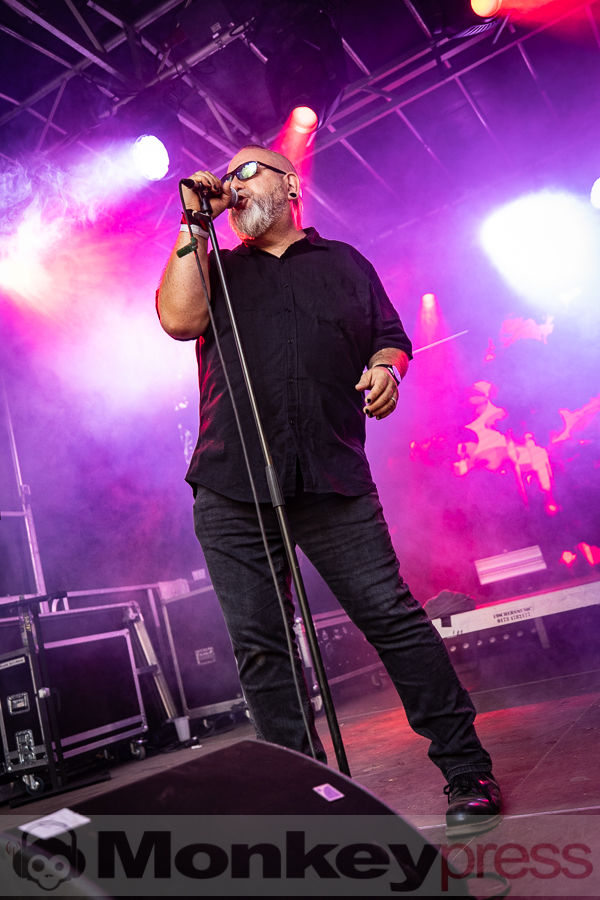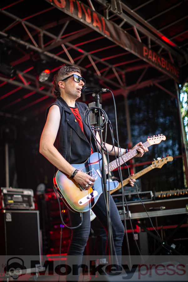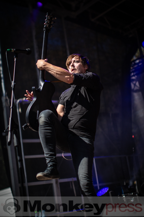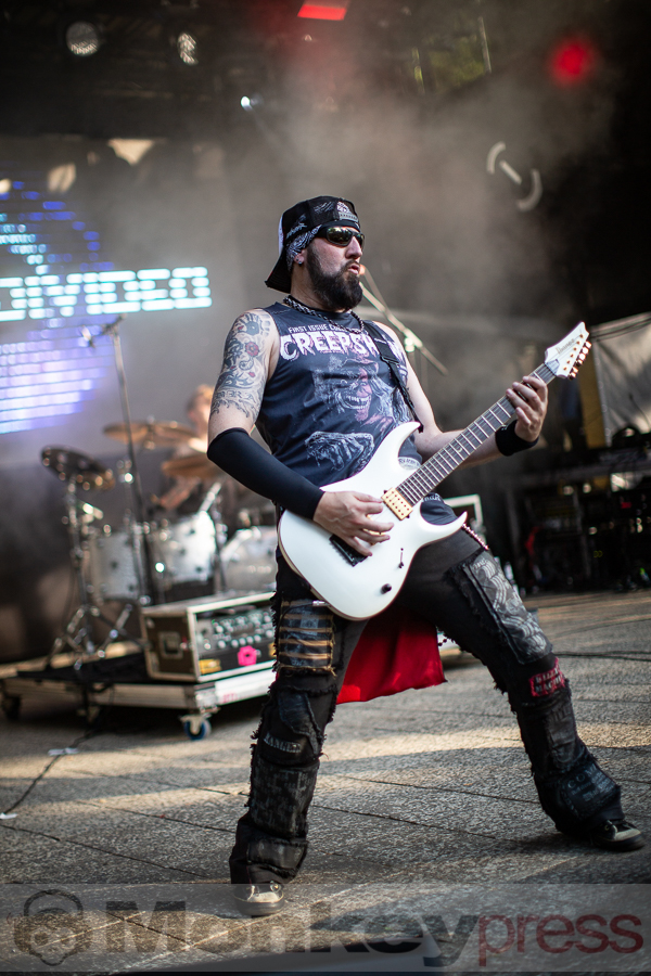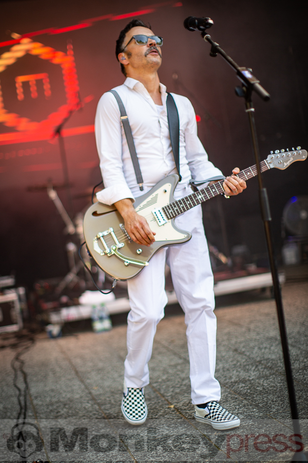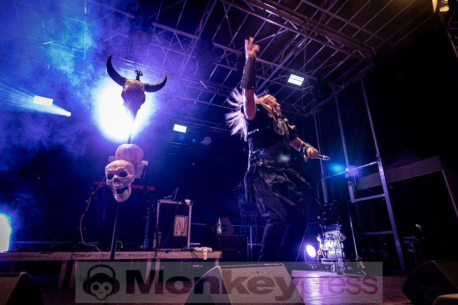 Vor der Parkbühne warteten anschließend bereits viele Zuschauer. Hier begann dann um 16:25 Uhr der Auftritt von End Of Transmission. Die Electro-Wave-Band wurde 2020 gegründet und hat seitdem ein Album veröffentlicht. Der eingängige Gesang und der melodische Sound zogen die Zuhörer sofort in ihren Bann und sorgten für eine mitreißende Atmosphäre. Musikalisch ganz anders ging es zeitgleich auf der Waldbühne weiter. Hier standen nun Bloodsucking Zombies From Outer Space auf dem Programm. Die Horrorpunk-Band stammt aus Österreich und macht schon seit mehr als 20 Jahren Musik. Der Stil reicht von Psychobilly über Horror-Punk bis zu Rockabilly. Sowohl visuell als auch musikalisch konnte die Band überzeugen. Sie lieferten eine spektakuläre Live-Show ab und begeisterten viele Zuschauer.