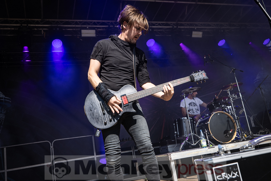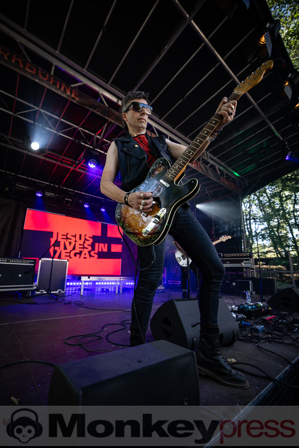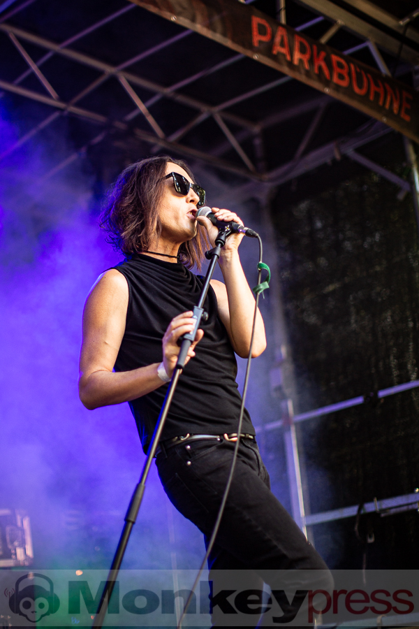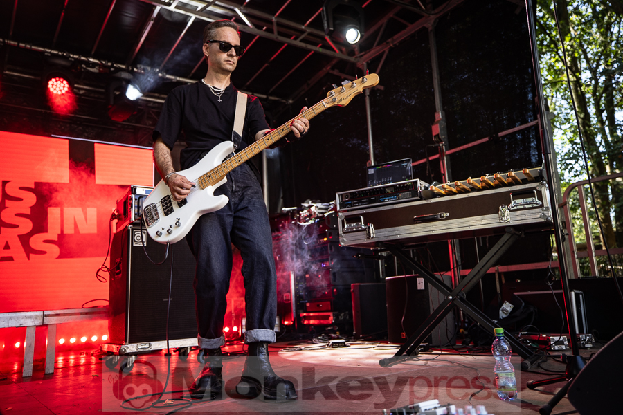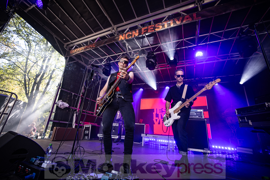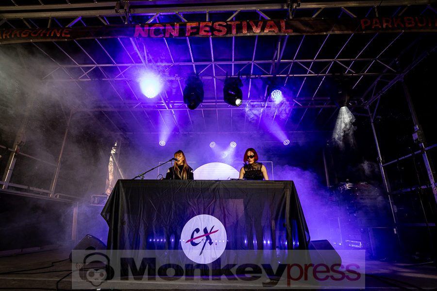 Bei intensiver Mittagssonne ging es um 13 Uhr mit der aus Chemnitz stammenden Dark-Rock-Band CNVX weiter. Die Band mischt harmonischen Gesang mit dynamischen Beats und einprägsamen Refrains. Insgesamt variiert der Sound über Rock und Pop bis zu Darkwave und Metal. Mit einem kraftvollen Auftakt brachte die Band das Publikum schnell in Bewegung. Ebenfalls um 13 Uhr startete auf der Parkbühne Jesus Lives In Vegas. Die Band stammt aus Nancy in Frankreich und hat dieses Jahr ihr erstes Album veröffentlicht. Sie verbindet geschickt Coldwave, Darkwave und Post-Punk. Live dominieren Gitarre und Bass. Neugierig verfolgten die Zuschauer auch diese Show.