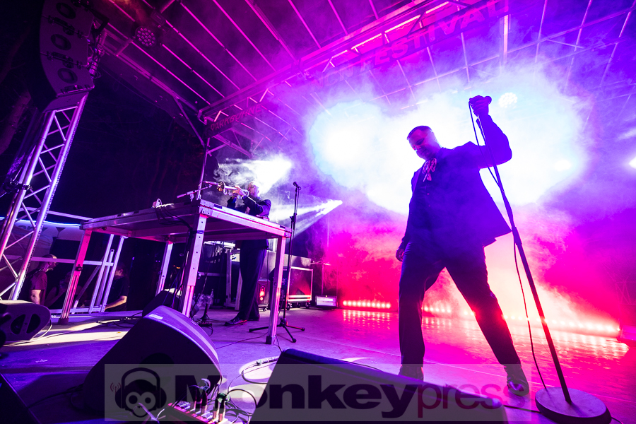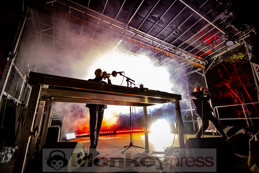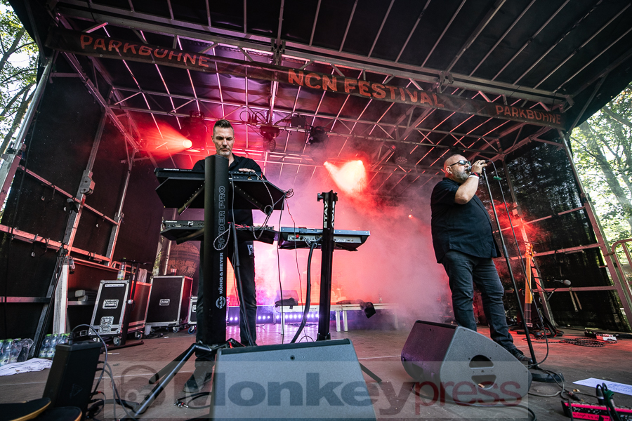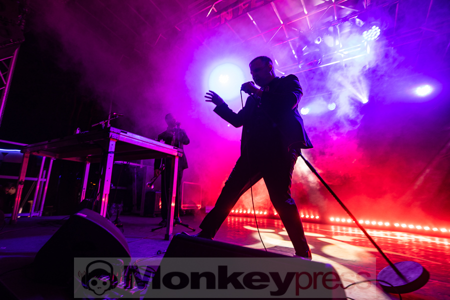 Als nächstes folgte um 21:00 Uhr auf der Parkbühne die Stuttgarter Electro-Wave-Band Die Selektion. Die Band vereint auf gekonnte Weise Elemente aus Darkwave, EBM und Synthiepop. Als besonderes Merkmal sticht die Verwendung der Trompete hervor. Die rhythmischen und harmonischen Songs kamen beim Publikum hervorragend an. Das mexikanische Elektro-Duo Hocico war zeitgleich der letzte Act auf der Waldbühne. Die Band hat in der Szene schon seit etlichen Jahren Kult-Status. Hier trifft klassischer EBM-Sound auf experimentelle Elemente und verzerrten Gesang. Sänger Erk Aicrag war wie immer energiegeladen. Das sorgte für eine ausgelassene Stimmung. Zu den schweißtreibenden und düsteren Songs konnte das Publikum nun ordentlich tanzen.