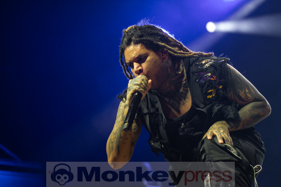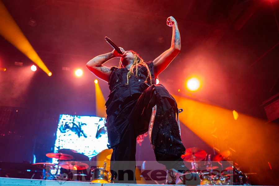 „Cologne, we wanna keep it fucking heavy tonight!“ Und der Fronter hat nicht zuviel versprochen. Soft spielte mit Nu-Metal-Elementen und aggressiven Vocals, während der Text sich mit der Kritik von außen und dem Umgang mit Hass beschäftigt – eine Art Kampfansage an Kritiker, die Motionless In White als „zu weich“ oder „nicht hart genug“ abtun. Chris gelang es das ganze Set über, eine besondere Bindung zu seinen Fans zu erhalten. Immer wieder hielt er sich am Bühnenrand auf und tauschte kontinuierlich Blicke mit den Menschen aus, die extra für seine Band vor Ort waren. Seine Kollegen standen ihm dabei in nichts nach. Sie nutzten die gesamte Bühne aus, wechselten oftmals ihre Positionen untereinander und auch ihnen war die Spielfreude ins Gesicht geschrieben.