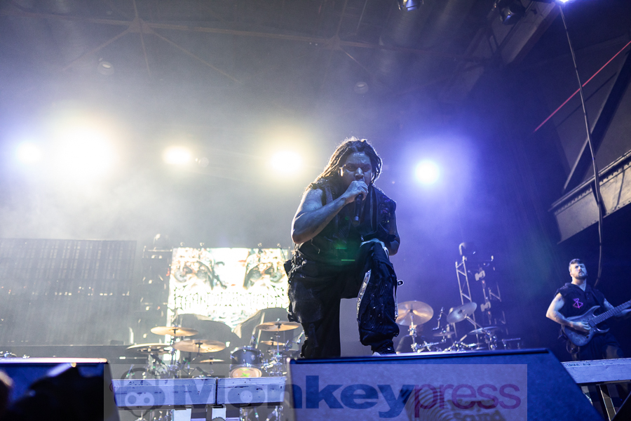 Und dann nahm das Unheil seinen Lauf. Gnadenlos eröffneten Brand of Sacrifice ihr Set mit dem Brocken Dawn. Frontmann Kyle Anderson übernahm sogleich das Kommando über die gespannte Crowd: „Cologne, open this fucking pit!“ Gemeinsam mit seinem Basser headbangte der hochgewachsene Sänger seine langen Dreads mit voller Wucht umher. Nachdem der erste Pit tatsächlich startete, folgte die nächste Ansage: „Put your hands in the motherfucking air!“ Zum Demon King schmetterte uns Kyle abwechselnd heftige Growls und biestige Screams entgegen. Inmitten des anwachsenden Circle Pits zog derweil ein junger Mann in einem rosafarbenen Einhorn Kostüm neugierige Blicke auf sich.