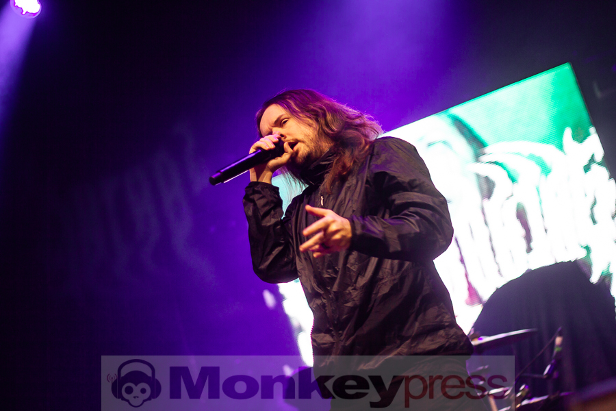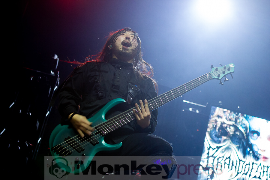 „Motionless“-Rufe bahnten sich daraufhin durch die Halle. „Is there anybody that have seen us live before? How many people are seeing us for the first time ever tonight? So fucking sick. Hopefully, we’ll see some of you guys when we come back in the summer. But until then. Here’s what we like to do to make sure that whether you’re seeing us for the 10th time or the first time. Maybe you know some of the lyrics? Maybe you don’t know any? We like to make sure that there’s one spot in one song of our set that everybody can sind along together. It’s very easy. What we’re gonna do is the middle of this next song. I scream two words, and then you’re gonna scream two more, right back at me. I say ‚One mutilation‘. And then every single one of you, even you guys on top. You can scream back at me ,Under God‘. This song is called ,Slaughterhouse‘.“