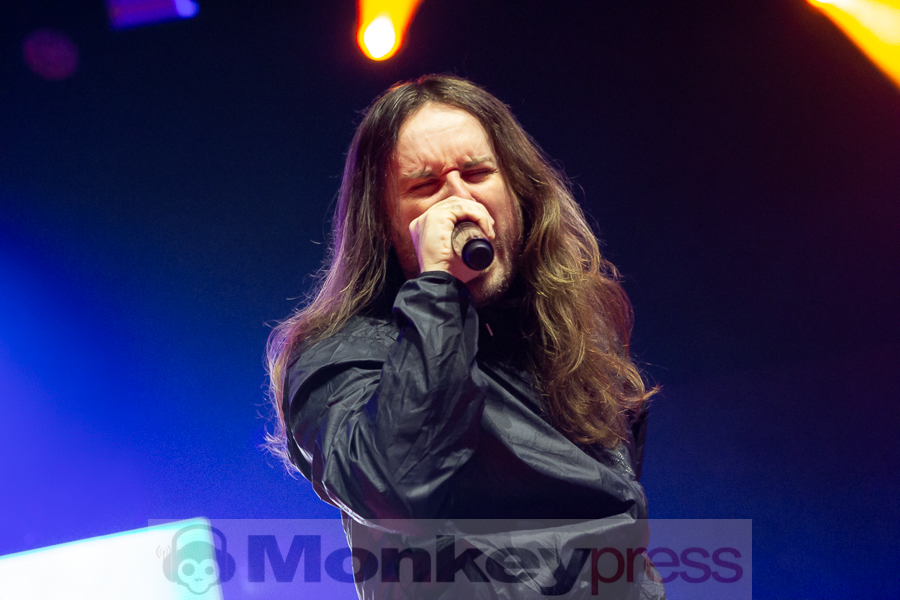 „Cologne, are you ready for a goddamn rock show?“ Und diese wurde uns hier wahrhaft geboten. Zu Necessary Evil schossen heftige Feuerschübe in die Höhe. Auf der Empore hat sich mittlerweile Ryan Kirby eingefunden, der den Gig interessiert verfolgte. „Thank you! Are you ready out there, Cologne? I want even more! When I count to four, jump all the way back up and down. This is ,Sign Of Life‘. Let’s go.“ Engagiert sprang die Crowd mit dem Fronter um die Wette, ehe die Kehlen bei dem epischen Refrain mit einstimmten: „You fall away into the light. Where numbness and pain are synchronized. If there’s a grave behind my eyes. Then how do the dead find a, find a sign of life?“ Die Tänzerinnen waren nun mit Winkelschleifern „bewaffnet“, die für spektakuläre mit Funkenflug-Effekte sorgten. An verschiedenen Stellen entstanden wuselige Pits. Chris nahm das ausgelassene Treiben in der Menge beeindruckt wahr und er wurde redselig: