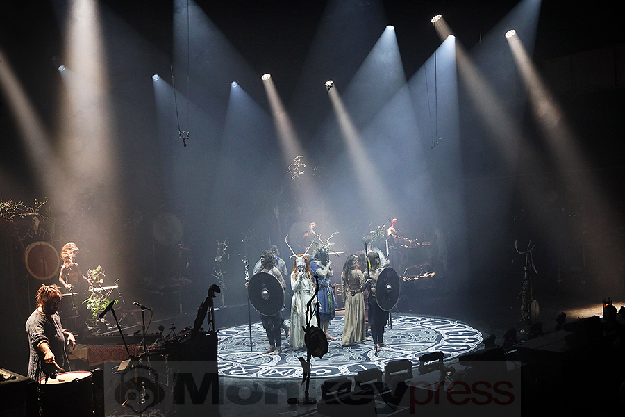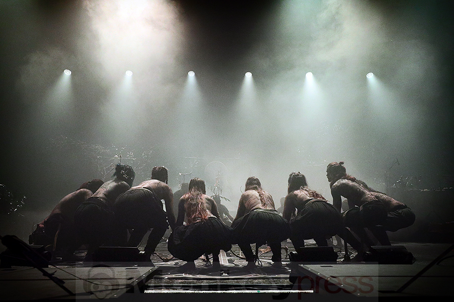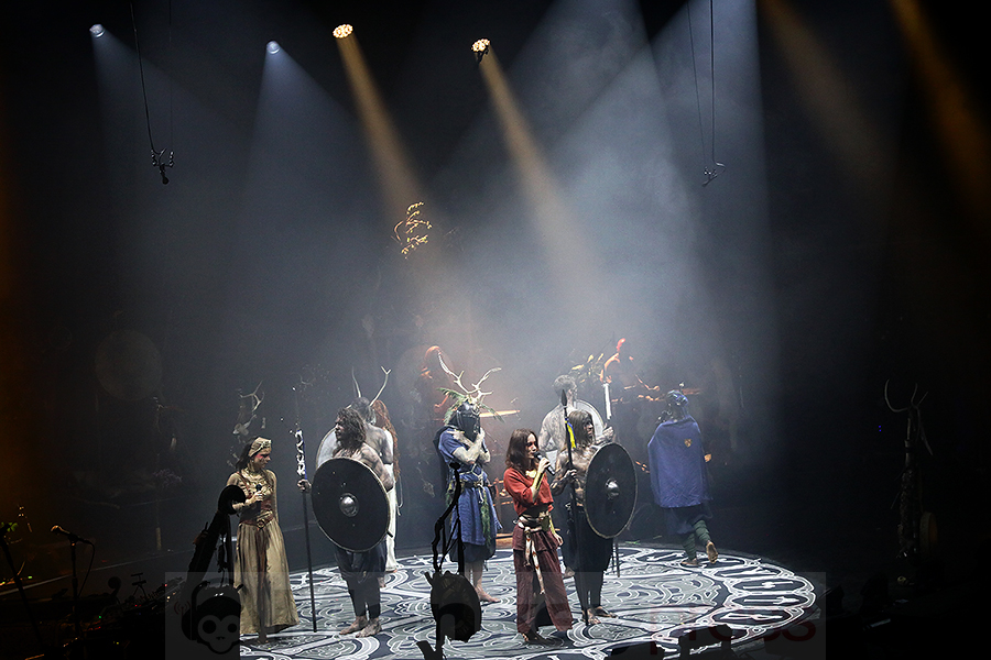 Die Turbinenhalle in Oberhausen verdunkelte sich, dichter Rauch stieg auf, und eine erhabene Stille legte sich über das erwartungsvolle Publikum. Es ist 21:00 Uhr, als die ersten Klänge der „Opening Ceremony“ ertönten. Vogelgezwitscher hallte durch den Saal, und Kai Uwe Faust schritt über die Bühne, während er mit Palo Santo, Salbei und Beifuß eine schamanische Rauchreinigung vollzog. Die Worte, die er dabei sprach „Remember, that we all are brothers – All people, beast, tree and stone and wind – We all descend from the one great being – That was always there – Before people lived and named it – Before the first seed sprouted“.“ durchzogen die Halle, zunächst von ihm allein rezitiert, dann von den anderen Bandmitgliedern aufgenommen und schließlich sogar von Teilen des Publikums mitgesprochen. Mit ihren traditionellen Gewändern, geschmückt mit Federn, Knochen und anderen natürlichen Materialien, formierten sich die Musiker in einem Kreis und eröffneten damit das Ritual.