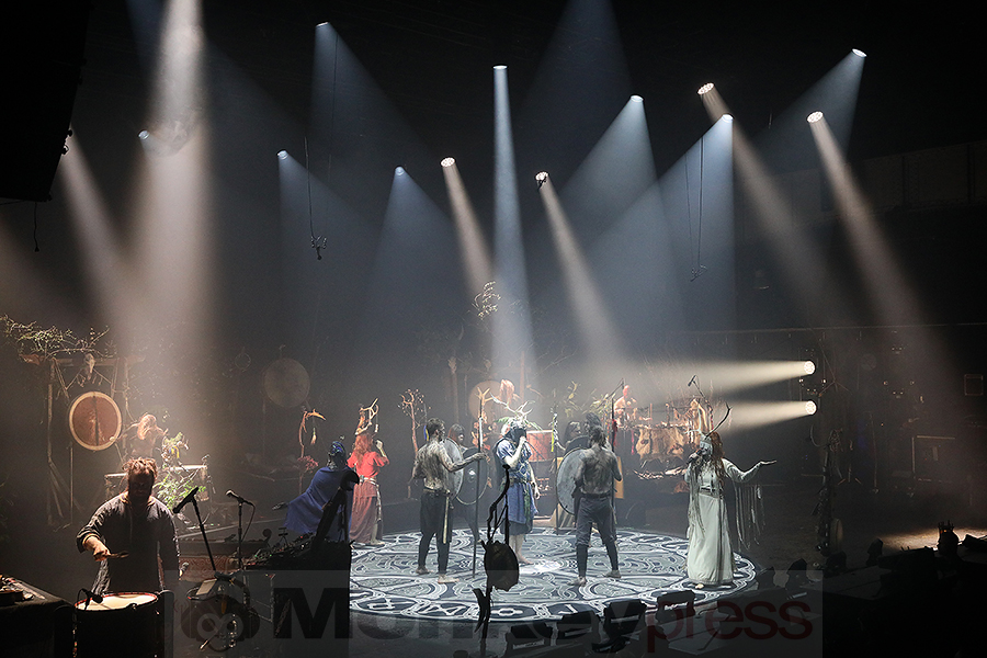Mit „In Maidjan“ schlug die Atmosphäre in eine erste tranceartige Bewegung um. Rhythmische Trommelschläge und der eindringliche Kehlkopfgesang von Faust durchbrachen die Stille, zogen so das Publikum in ihren Bann. Die passende Lichtshow verstärkte die Wirkung dieses urtümlichen, archaischen Klangteppichs. „Norupo“, basierend auf dem ältesten bekannten Runengedicht, intensivierte diese Stimmung und bereitete den Boden für „Alfadhirhaiti“, ein kraftvolles und ritualhaftes Stück, das mit tiefen Trommelschlägen und eindringlichen Gesängen eine intensive Atmosphäre erschafte. Die hypnotischen Melodien von „Asja“ und „Svanrand“ ließen die Zuhörer dann in eine Art meditative Trance sinken. Besonders „Svanrand“, das mit einem besonderen Gänsehautmoment begann: Ein Wolfsgeheul aus den Reihen des Publikums schwoll an, breitete sich aus und verschmolz nahtlos mit den Klängen der Band – ein Moment von ergreifender Intensität, der die mystische Aura des Abends verstärkte. Mit seinem Wechselspiel aus Gesang und Percussion, trug der Song dann das Publikum tiefer in die archaische Welt Heilungs.