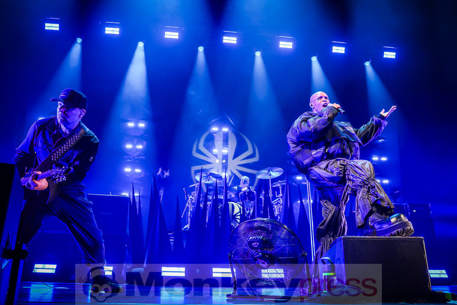 Und dann war es soweit! Das prächtige Drumset von Mark Richardson war von schwarzen mannshohen Stacheln umrahmt. Passend zum Intro klatschten die Fans engagiert im Takt. Der Bühnenbereich verdunkelte sich und einzig das Publikum erschien im hellen Licht der Scheinwerfer. Im Hintergrund leuchtete das markante Spinnenlogo von Skunk Anansie in leuchtendem pink auf. Nachdem die Musiker nach und nach ihre Spielstätte betraten, stapfte Deborah Anne Dyer alias Skin mit ausladenden Bewegungen auf die Bühne. Ihre schwarze Jacke war bis aufs äußerste aufgepustet. Zu ihrer weit geschnittenen Hose trug die Sängerin hohe Plateau-Boots. Was für ein Look! Wir hörten „This Means War“. Zu astrein (!!!) abgemischtem Sound fegte Skin selbstsicher über ihre Auftrittsfläche. Gekonnt nahm sie unterschiedliche Posen ein und schlich sich dann an Richard „Cass“ Lewis heran, der gerade inmitten eines Lichtkegels in den Fokus gerückt wurde. Was für ein Auftakt!