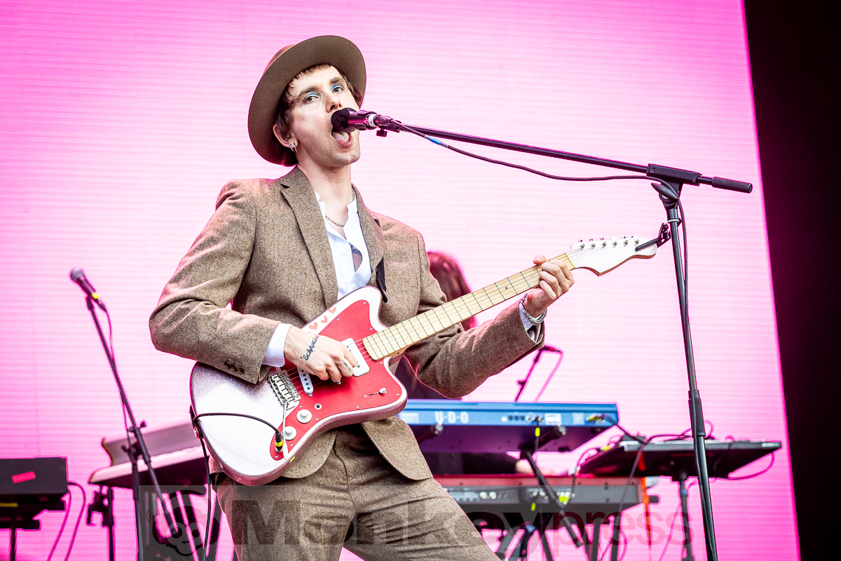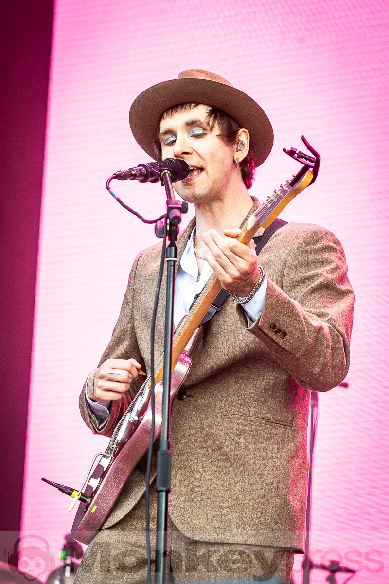 Max Gruber alias Drangsal schritt in feinem Zwirn und Hut auf die Orbit Stage, flankiert von fünf Mitstreitern – ein eleganter Kontrapunkt zur rauen Festivalbühne. Vor einem schlichten rosafarbenen Hintergrund stimmte er mit dem kräftigen „Die satanischen Fersen“ an – ein fulminanter Start, der Stimme und Bewegung gleichermaßen Raum gab. Der Beat sprang direkt in die Hüften, die Band spielte mit voller Hingabe, während Gruber zwischen New Wave, Post‑Punk und Indie‑Pop pendelte. Live zeigte er sich gleichermaßen wortgewandt wie theatralisch – mal poetisch, mal bissig – besonders mit Songs wie „Schnuckel“, das mit ironisch-surrealem Charme begeisterte. Als er schließlich zu „Pervert the Source“ in die Menge stieg, löste sich die Grenze zwischen Bühne und Publikum endgültig auf. Ein Auftritt, der Drangsal nicht nur als charismatischen Künstler, sondern als Genie des Abends präsentierte – er verwob seine „Exit Strategy“-Ästhetik mit musikalischer Leidenschaft und bewies: Deutschpop kann genauso packend und federleicht sein wie intensiver Post-Punk.