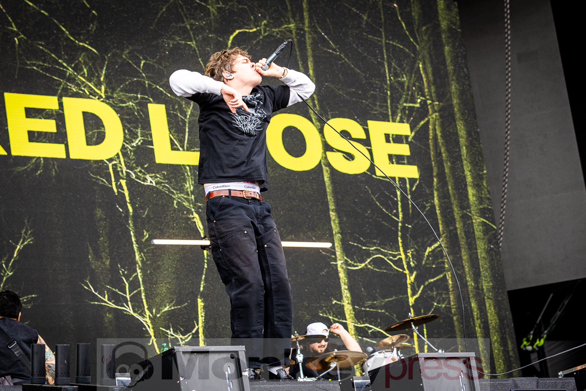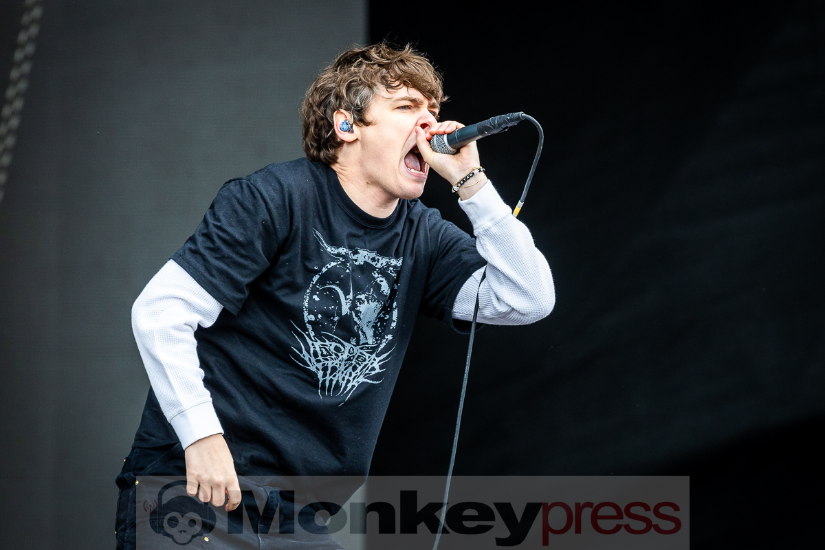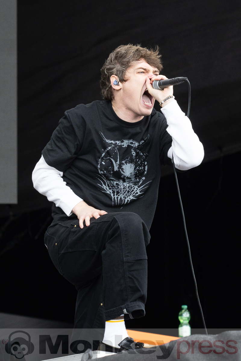 Auf der Utopia Stage kam es jetzt knüppelhart. Wenige Tage vor dem Festival als dritter Überraschungsgast angekündigt, betraten Knocked Loose die Bühne – und rissen den Ring förmlich ab. Ein mächtiges LED-Kreuz erhob sich hinter den Drums – ein kurzer Moment trügerischer Stille – bevor das unleugbare Chaos ausbrach. Schon beim Opener „Don’t Reach For Me“ preschte Bryan Garris los, seine Stimme zersprengte die Atmosphäre, während Gitarrist Isaac Hale finster über die Menge blickte. Der Pit war sofort in Aufruhr, als hätten alle aufs Kommando aufgedreht, und bei „Blinding Faith“ ergoss sich die erste Bierdusche in Moshpit-Manier. Garris und Co. ließen ihre Köpfe kreisen wie entfesselte Derwische, kein Mikroton wurde verschont. Und die Crowd? Sie tobte, schrie zurück, wurde zu einem Teil der Show. Ihr Set war eine erbarmungslose Abrissbirne und forderte alles, was das Publikum zu geben hatte. Knocked Loose zeigten eindrucksvoll: Nach Disco-Donner und Amore-Pop kann auch mal ein Hardcore-Tsunami folgen – Rock am Ring zeigte sich in all seinen Extremen.