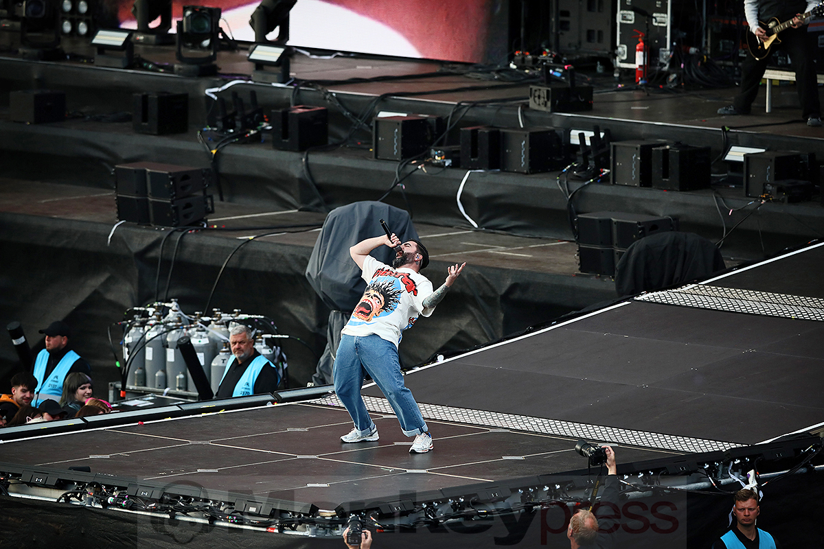 Mit „AmEN!“ entfachten sie ein infernalisches Manifest, laserrote Beleuchtung, dystopische Visuals, Fire-Effects – ein purer Wahnsinn. „Antivist“ wurde zum interaktiven Ritual: Oli holte Fan Kristina auf die Bühne, ließ sie das Mikro übernehmen – dann sprang die Crowd in eine massive Wall of Death. Das darauffolgende „Can You Feel My Heart?“ wurde begleitet von Konfetti-Herzen im Nachthimmel – ein emotionaler Gänsehaut-Moment. Auf den Screens erschien ein Video, das die intime Bandhistorie einfing und die Zeit stillstehen ließ. Zu „Drown“ gesellte sich Oli in den Bühnengraben, hielt das Publikum in Händen – nahbar, verletzlich, ergreifend. Der finale Knall kam mit „Throne“, begleitet von Visuals, Feuerschüben und purer Intensität – ein Abschluss, so gewaltig, dass man kaum glauben konnte, es sei schon vorbei. Bring Me the Horizon sind keine bloßen Headliner – sie sind elektrisierende Katalysatoren. Ihr Set zeigte eine Band, die sich konsequent weiterentwickelt, zugleich ihre Wurzeln ehrt und das Festival mit einem unvergesslichen Abend auf den Kopf stellte.