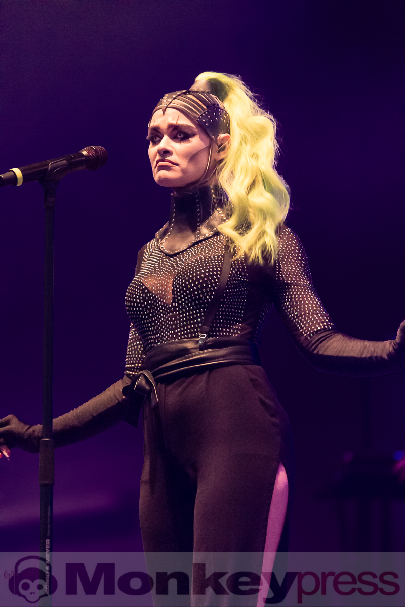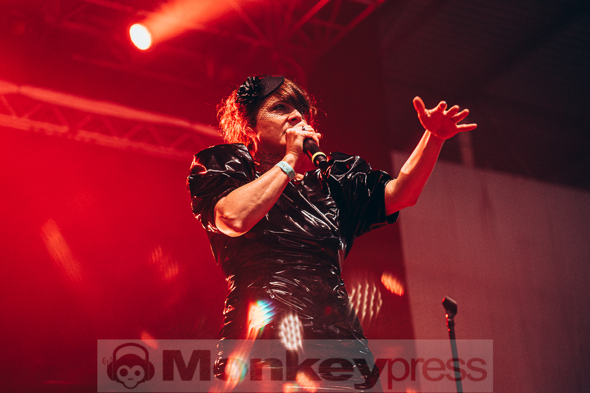 Es ging weiter mit tollen Frauenstimmen. Genauer gesagt: einer tollen Frauenstimme. Skynd aus Australien sind rare Gäste auf deutschen Bühnen. Hinter dem Projekt, deren Sängerin sich weiterhin in Anonymität hüllt, steht ein Konzept: Die Songs thematisieren True-Crime-Geschichten, tragen oft einschlägige Titel wie „Columbine“, „Richard Ramirez“ oder, ganz frisch veröffentlicht, „Aileen Wuornos“. Auf das Zeigen der oft mit viel Aufwand produzierten Musikvideos, die nicht immer ganz jugendfrei sind, wurde verzichtet, Skynds Stimme allein war aber packend genug. Die Dame wechselt mühelos zwischen kindlichem Gesäusel, opernhaften Diven-Gesang und kraftvollem Rock-Organ, die Hooks auf zumeist Industrial-rockigem Unterbau sitzen. Ein frühes Highlight des diesjährigen WGT. Beim Amphi und bei Wacken werden Skynd noch zwei weitere Auftritte in Deutschland absolvieren, Hingehen lohnt!