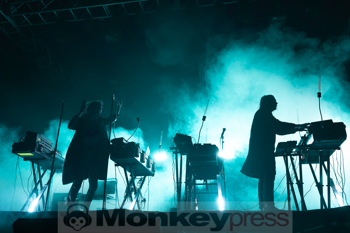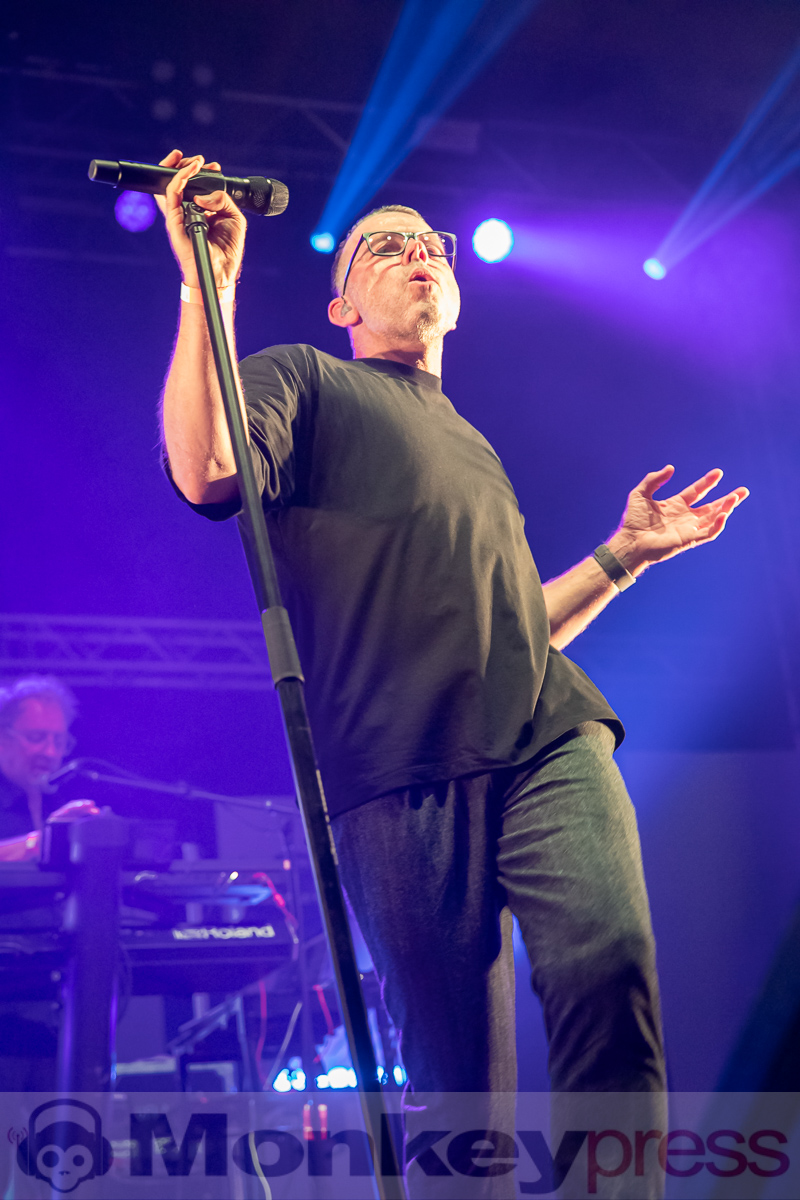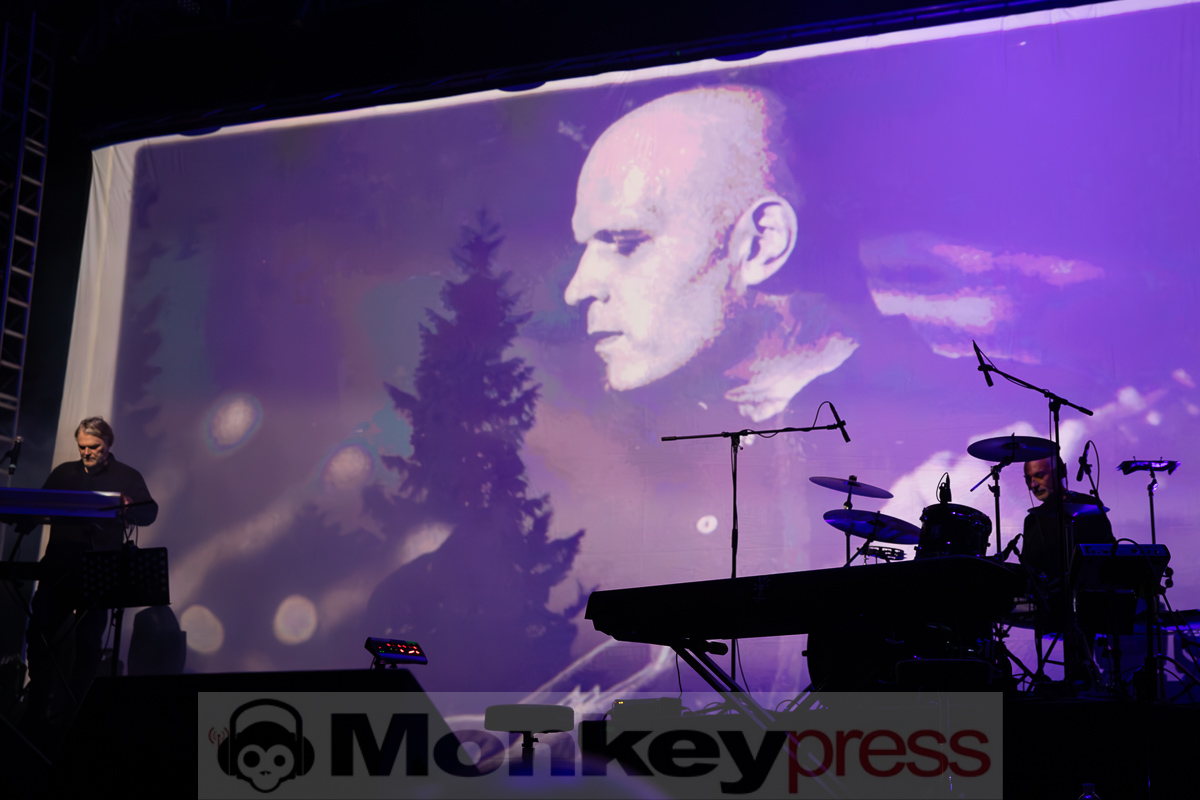 Mittlerweile war es im Inneren der Agra sehr voll geworden. War es der tolle Auftritt von Skynd? Oder doch schon die pilgernde Schar von Neugierigen, die unbedingt die Performance des prominentesten und international erfolgreichsten Acts des WGT 2025 verfolgen wollten? Die Wahrheit liegt wohl irgendwo in der Mitte. Jedenfalls kam es bei Alphaville zum Einlassstopp. Marian Gold, der die 70 mittlerweile durchschritten hat, wird mittlerweile von zwei Gastsängerinnen unterstützt, die ihren Job deutlich hörbar, aber nicht zu aufdringlich erledigten. Live-Auftritte von Alphaville sind ohnehin Geschmackssache. Einige Lieder durchlaufen auf der Bühne eine klangliche Metamorphose, ein „A Victory Of Love“ beispielsweise ist im Vergleich zur Albumversion von 1984 kaum noch zu erkennen. Darüber hinaus neigt Marian Gold manchmal dazu, mehr zu schreien denn zu singen. Was er sich am späten Freitagabend diesmal zum Glück kniff. Das Alter machte sich dennoch stellenweise bemerkbar. Schon witzig, wie der gebürtige Herforder an zweiter Stelle zu „Dance With Me“ wild tanzte – um die darauffolgende Zwischenansage schwer schnaufend ins Mikro zu japsen. Die Kondition war aber da, in der Folge lieferten Alphaville ein Hit-Feuerwerk mit den wichtigsten Klassikern. Gerade das Doppel aus „Sounds Like A Melody“ und dem ewigen „Forever Young“ wurde wenig überraschend sehr laut mitgesungen und kreierte Jubelstürme in der Agra. Was sich auch bei den Schweden Kite, den vielleicht beliebtesten Vertretern der aktuellen Synthie-Pop-Generation, im Anschluss zur Geisterstunde nicht ändern sollte.