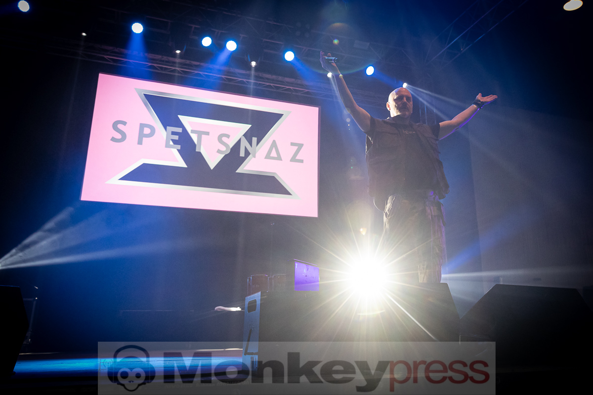 Der Samstag hielt in der Agra unter anderem zwei ganz besondere Highlights für Liebhaber von Oldschool-EBM parat. Spetsnaz, die das totgeglaubte Genre mit ihrem Album „Grand Design“ 2003 quasi wiederbelebten, spielen nach jahrelanger Pause wieder einzelne Konzerte. Nach dem E-Tropolis in Oberhausen Ende März reisten Drummer Stefan Nilsson und Sänger Pontus Stahlberg nun zu einem zweiten Deutschland-Gig nach Leipzig, um vorwiegend Klassiker zu performen. Mit „Hate“ schaffte es immerhin ein unveröffentlichtes Stück in die Setlist, zuvor entzündeten „Allegiance“, „Silence Implies Consent“ oder „Free Fall“ den Pit. Spätestens mit „Apathy“ erreichte die Stimmung ihren Höhepunkt und etwaige Mensch-Maschinen (die mit trainiertem nackten Oberkörper, nicht die mit roten Hemden und schwarzer Krawatte) tobten sich wie gewohnt ohne Rücksicht auf Verluste aus. Hat Spaß gemacht – und zumindest für Pontus sollte der Arbeitstag noch nicht beendet sein.