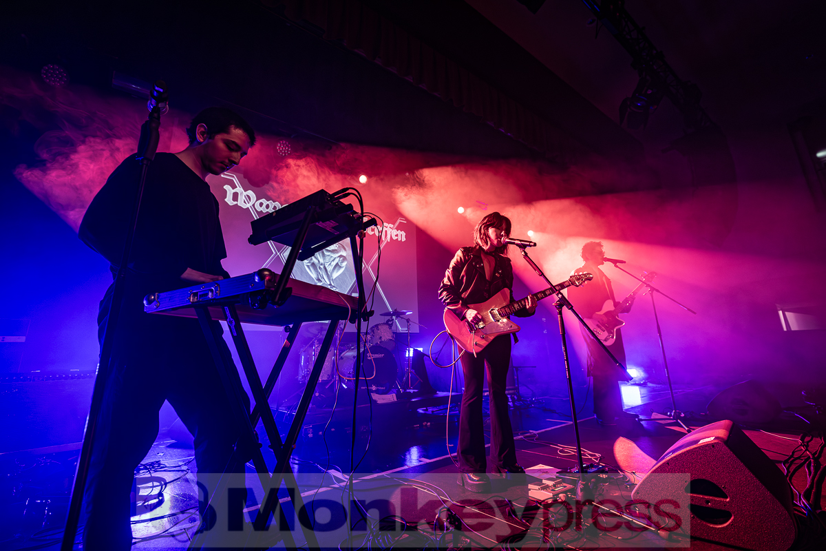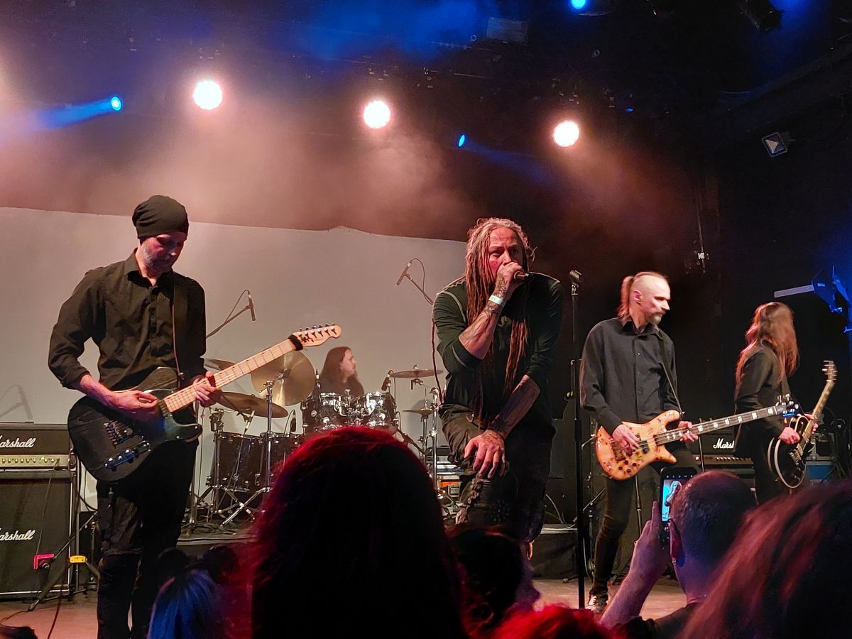Eine dringend nötige Mütze Schlaf, ein supernettes Fan-Treffen mit Honey und M.A. Peel von Welle:Erdball in der Innenstadt-Kneipe Dr. Faustus und knappe 16 Stunden später ging es dann so richtig los. Im Täubchenthal ergab sich tatsächlich die Möglichkeit, einem alten Studienfreund beim Musizieren (präziser: Schlagzeug spielen) zuzuschauen und zuzuhören – das passiert im Rahmen eines Events wie dem WGT wahrlich nicht alle Tage. Sweet Ermengarde eröffneten in der schnieken Location im Leipziger Westen mit elegischen Gothrock. Auf der Setlist standen vielen Songs des 2024er-Albums „Sacrifice“ – kein Wunder, ist es doch das erste mit dem neuen Sänger Drew Freeman. Nicht nur wegen dessen rauen, tiefen Timbre passt wohl am ehesten der Vergleich mit Fields Of The Nephilim. Denn auch Sweet Ermengarde trauen sich gerne mal an komplexe, lange Stücke, aber auch knackige Hymnen mit eingängigen Refrains. Dass technisch nicht alles glatt lief und beispielsweise kurz vor Schluss Freemans Mikro für mehr als eine Minute ausfiel, verlieh der Begeisterung des Publikums keinen Abbruch.