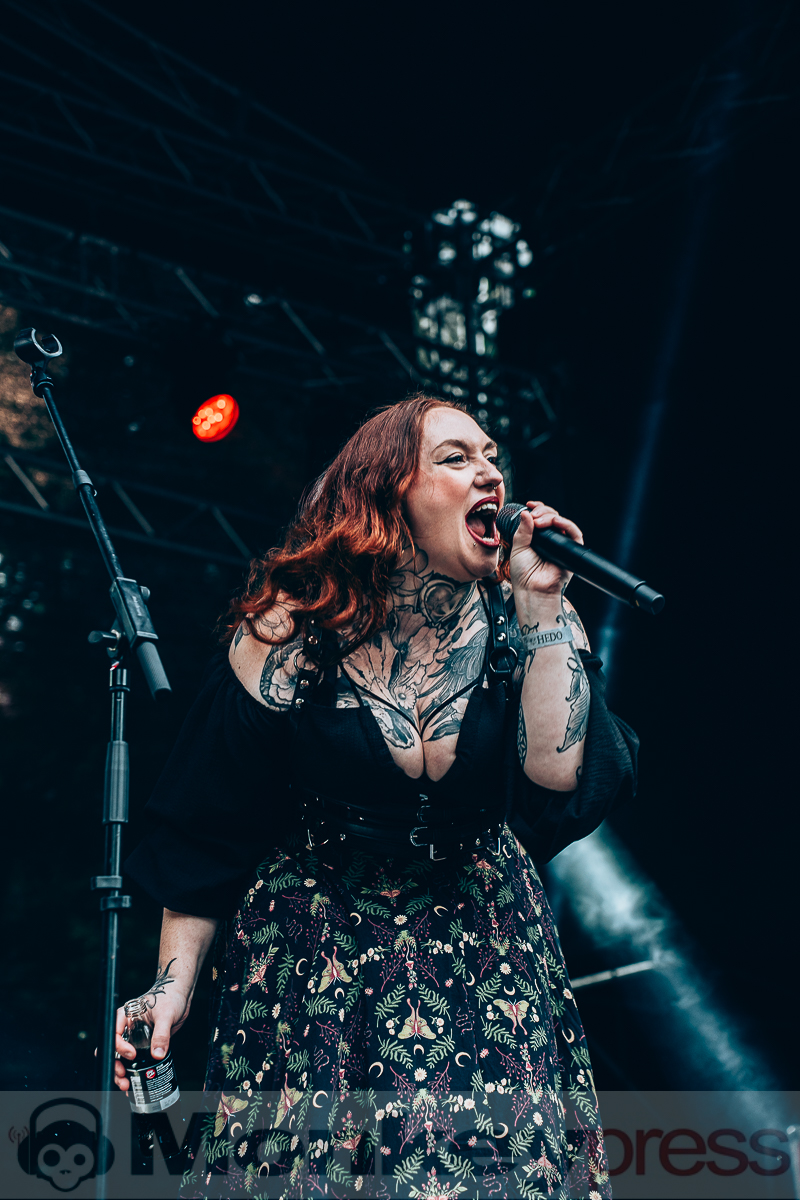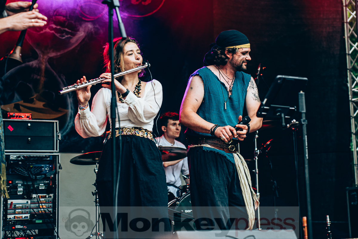 Zeit für musikalische Abwechslung, auf in Richtung Heidnisches Dorf. Was für ein Kontrastprogramm, denn dort spielten Kupfergold. „Fasan Alarm“, das aktuelle Album der Folk-Gruppe um Sängerin Bonnie Banks, kletterte eine Woche vor dem WGT auf einen bemerkenswerten Chartplatz 14. Wenn man bedenkt, wie erfolgreich musikalisch ähnlich gelagerte Gruppen wie Versengold oder Mr. Hurley und die Pulveraffen aktuell sind, dürfte dies noch nicht das Ende der Fahnenstange sein. Starke Stimme, sympathisch-lockere Zwischenansagen und griffige Mitsing- und Schunkel-Refrains, die sich vor Kraftausdrücken nicht immer scheuen (Anspieltipp: „Am Arsch“) – das Erfolgsrezept hat in der jüngeren Vergangenheit schon bei vielen reinen Männerbands funktioniert. Im Dezember sind Kupfergold Teil von Subway To Sallys „Eisheiliger Nacht“ und dürften ihre Fangemeinde dort weiter vergrößern. Der vom vormittäglichen Regen leicht angeschlammte Platz vor der Bühne war bestens gefüllt, die Stimmung großartig.