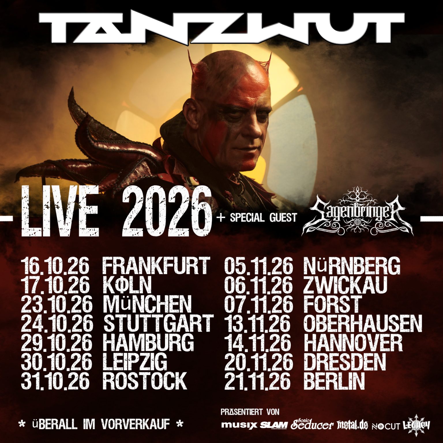 Parallel zur Albumveröffentlichung geht es 2026 auch wieder auf Tour – unterstützt werden Tanzwut dabei von der Band Sagenbringer. Freut euch auf mitreißende Konzerte, intensive Momente und die einzigartige Atmosphäre, die Tanzwut-Liveshows so besonders macht.