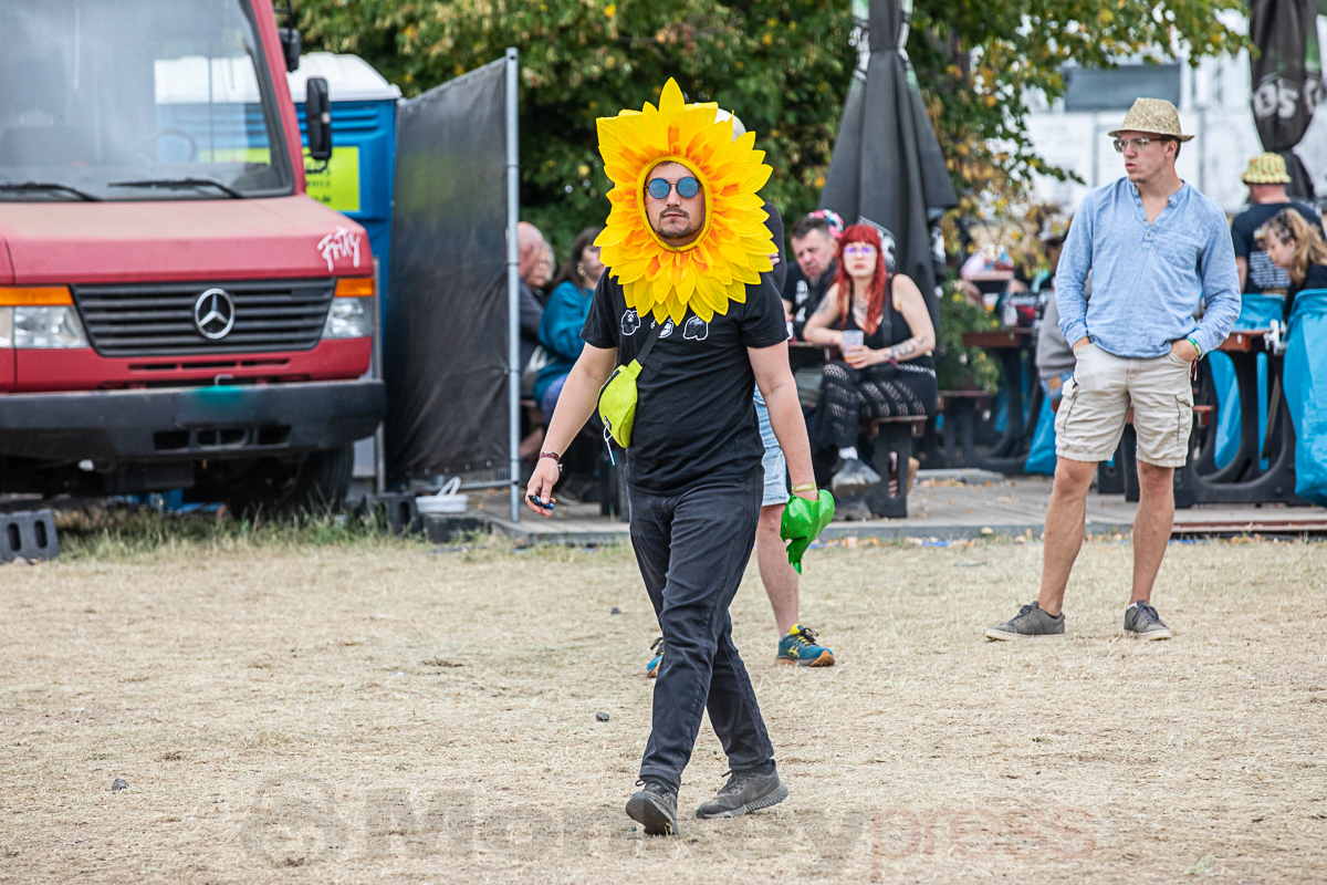 An diesem Festival-Samstag war die Sonne nicht ganz so unerbittlich, so dass die Temperaturen angenehmer waren. Das machte gleich gute Laune und so kamen wir freudig gegen Nachmittag an. Wir fanden direkt wieder gut einen Parkplatz und sogen beim Gang aufs Gelände die gute Stimmung in uns auf. Auf dem Zeltplatz war viel los und vor dem Konzert-Gelände wurde Tischtennis, Football und anderes gespielt. Alle hatten ein Lächeln im Gesicht und genauso muss es sein.