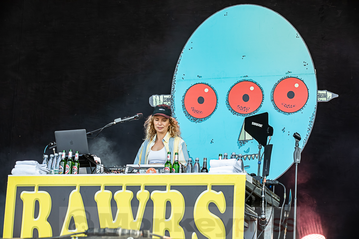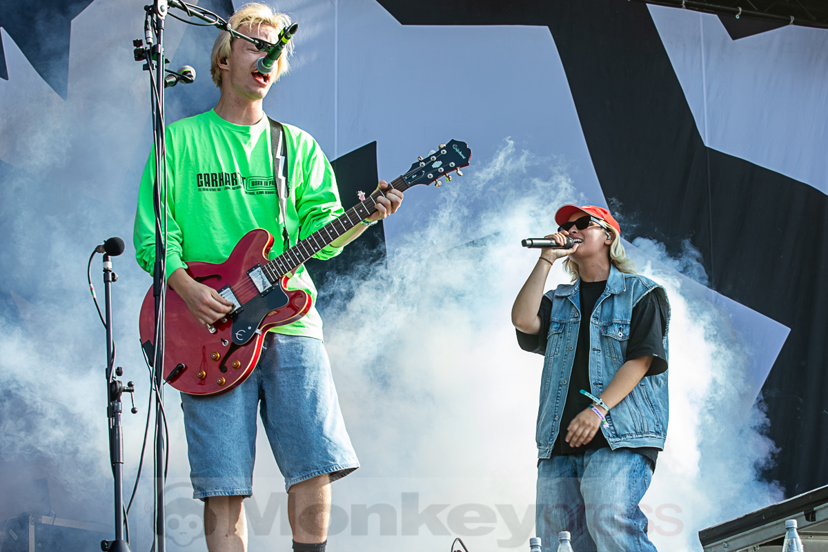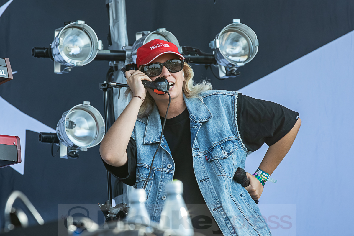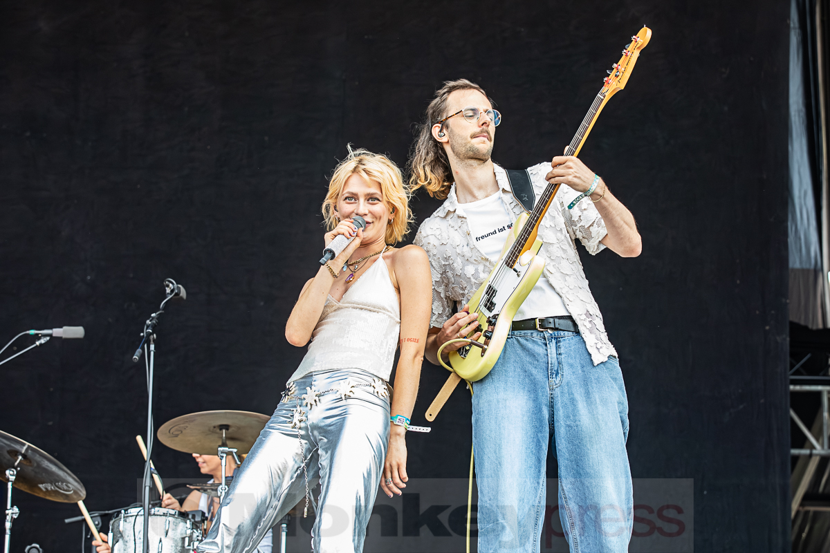 Uns wurde immer klarer, wieso so viele Zuschauer ein Tuch vor dem Mund hatten – clevere Idee! Die Jungs aus der Band sangen mit, was schön klang. Dann machte sich die Sängerin einen Spaß daraus, einen Typen im Moshpit hochzunehmen – „So fühlt es sich an, wenn Frauen die Macht in der Hand haben“ – der dann auch noch auf die Bühne kommen durfte. Nach „Es regnet Hirn“ stellte sie einen Song vor, an dem sie noch arbeitete – „Wo ist der Bus?“ kam sofort an und wurde mitgesungen. Mit Sicherheit ist das Stück auf einem kommenden Album enthalten, so gut, wie er hier funktionierte. Und als Paula dann auch noch ankündigte, dass sie bald auf Tour gehen wird, war der Höhepunkt erreicht. Die Menge tobte und gemeinsam wurde noch eine Weile abgefeiert. Grandios gemacht. Wir hatten unsere Freude daran und feiern die vielen Flinta-Acts in diesem Jahr auf dem Highfield sehr!