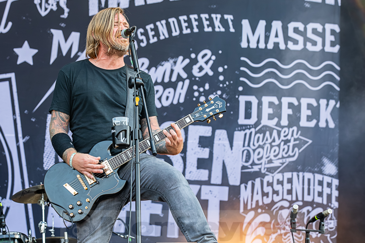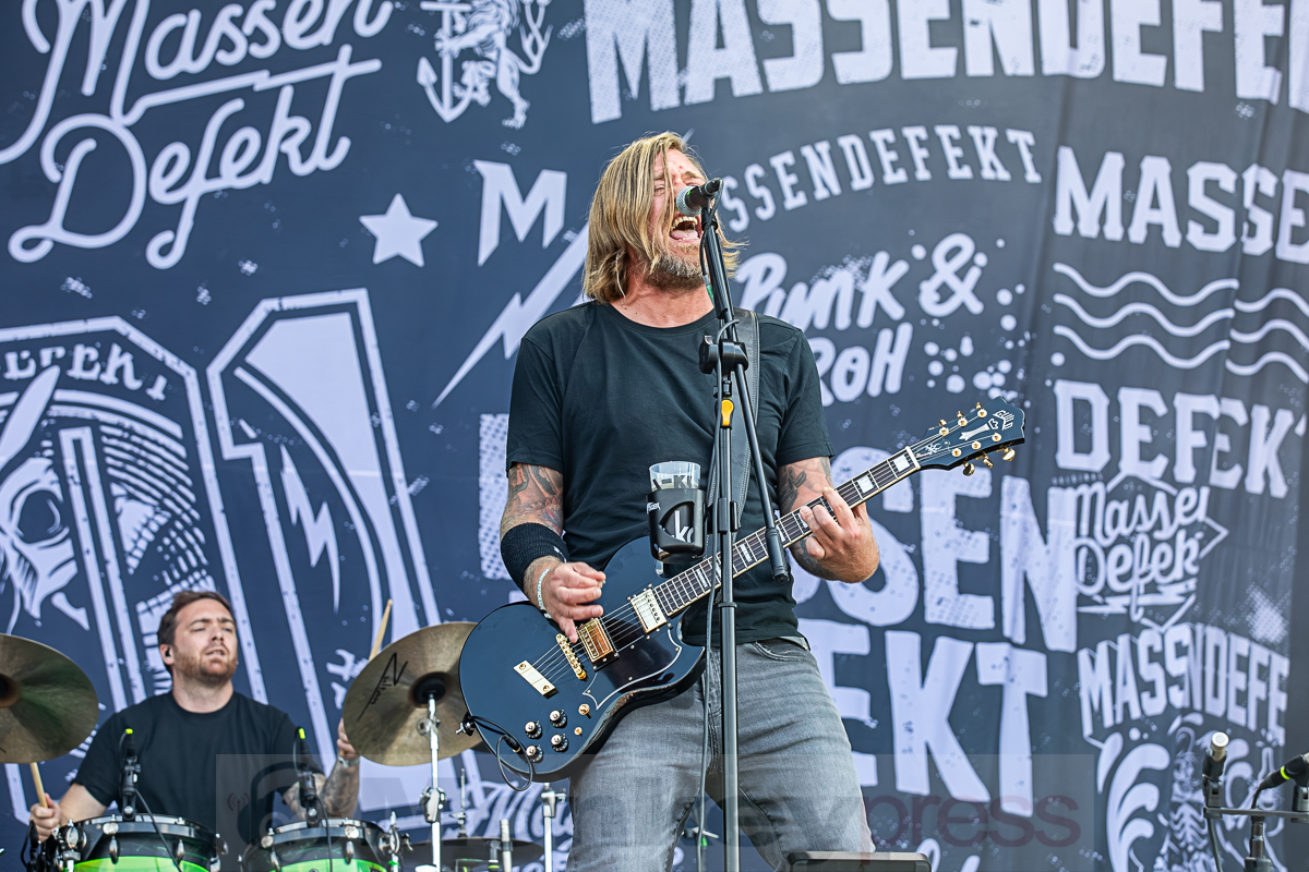Punkrock war nun auf der Green Stage angesagt, denn Massendefekt aus Nordrhein-Westfalen waren angereist, um die Hütte abzureißen. Mit einem „Schönen guten Tag zu früher Stunde“ begrüßten die Punkrocker ihr Publikum und schon ging es in die Vollen. Direkt beim ersten Song „Der Hoffnung entgegen“ flogen aus dem Bühnengraben große aufgeblasene Strandbälle in die Menge und sorgten für Spaß. Die Arme waren wegen der Musik ja sowieso oben und so konnten die Bälle gut hin und her geworfen werden. Bei „Mauern“ wurde der Refrain von den Fans aus vollem Halse mitgegrölt, während im Moshpit gesprungen und getanzt wurde. Wieder entstand dadurch schnell eine riesige Staubwolke, die über das Gelände waberte.